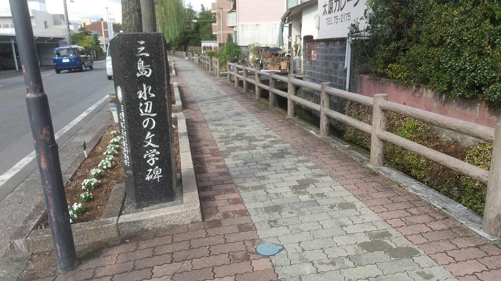 白滝公園から桜川沿いに三島大社までの間の散歩道に文学碑が並んでいます。