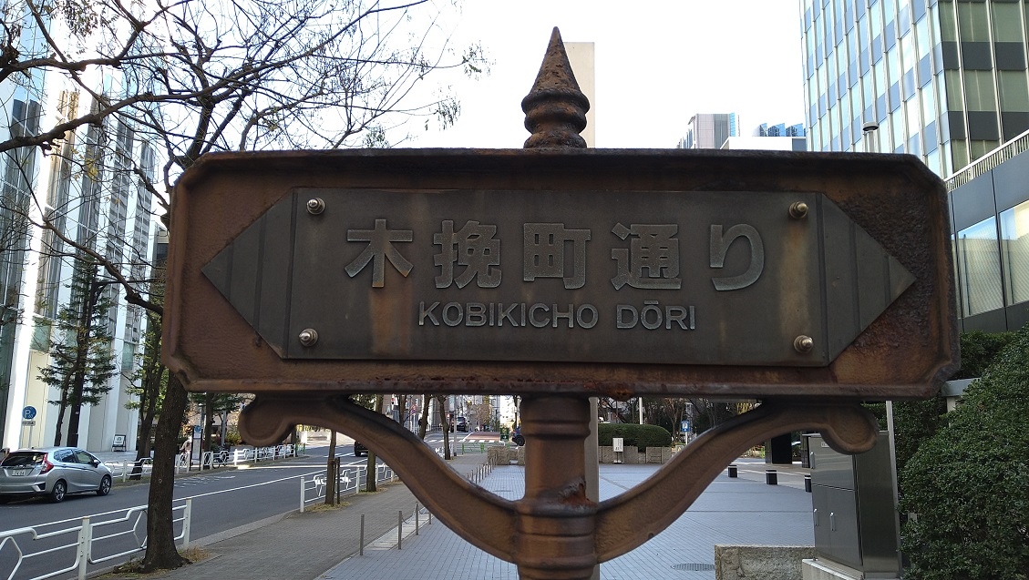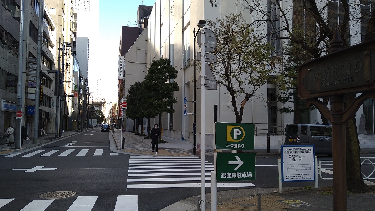 銀座の通りの名前で、昭和通りと並行に走り、歌舞伎座の東側を通る道で、銀座3丁目から銀座8丁目まで続く約840m続く長い道で【こびきちょうとおり】と読みます。江戸時代の慶長年間にはこのあたりに、三十間堀という堀が有り、その東側に木挽き職人が住んでいたことから木挽町と呼ばれるようになったそうです。晴海通りと交差する部分には横断歩道が無いので、回り道をする必要があります。