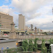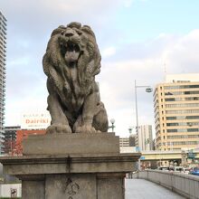 堺筋を土佐堀川から中之島、堂島川の上をまたいで架けられた大正4年のアーチ橋です。中之島から階段を上がって橋の上に出ると、ライオンの後ろ姿が見えてきました。左側の咆哮するライオンの勇姿を正面から鑑賞しました。堂島川に架けられた橋はどれも、東京日本橋と同じく、上を通る高速道路が景観を損ねていて残念な感じでした。