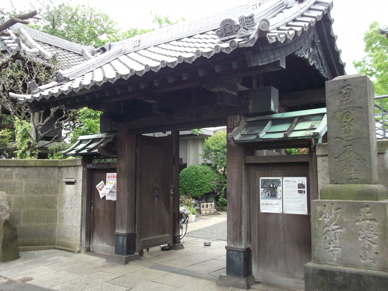 谷中のヒマラヤ杉のすぐ向かいにある日蓮宗の寺院です。立派な造りの山門を通り抜けると、まっすぐに続く参道の先に重厚感のある本堂が見えました。境内には鐘楼のほか多くの石柱が並び、樹木もきれいに整えられていて落ち着いた雰囲気がありました。