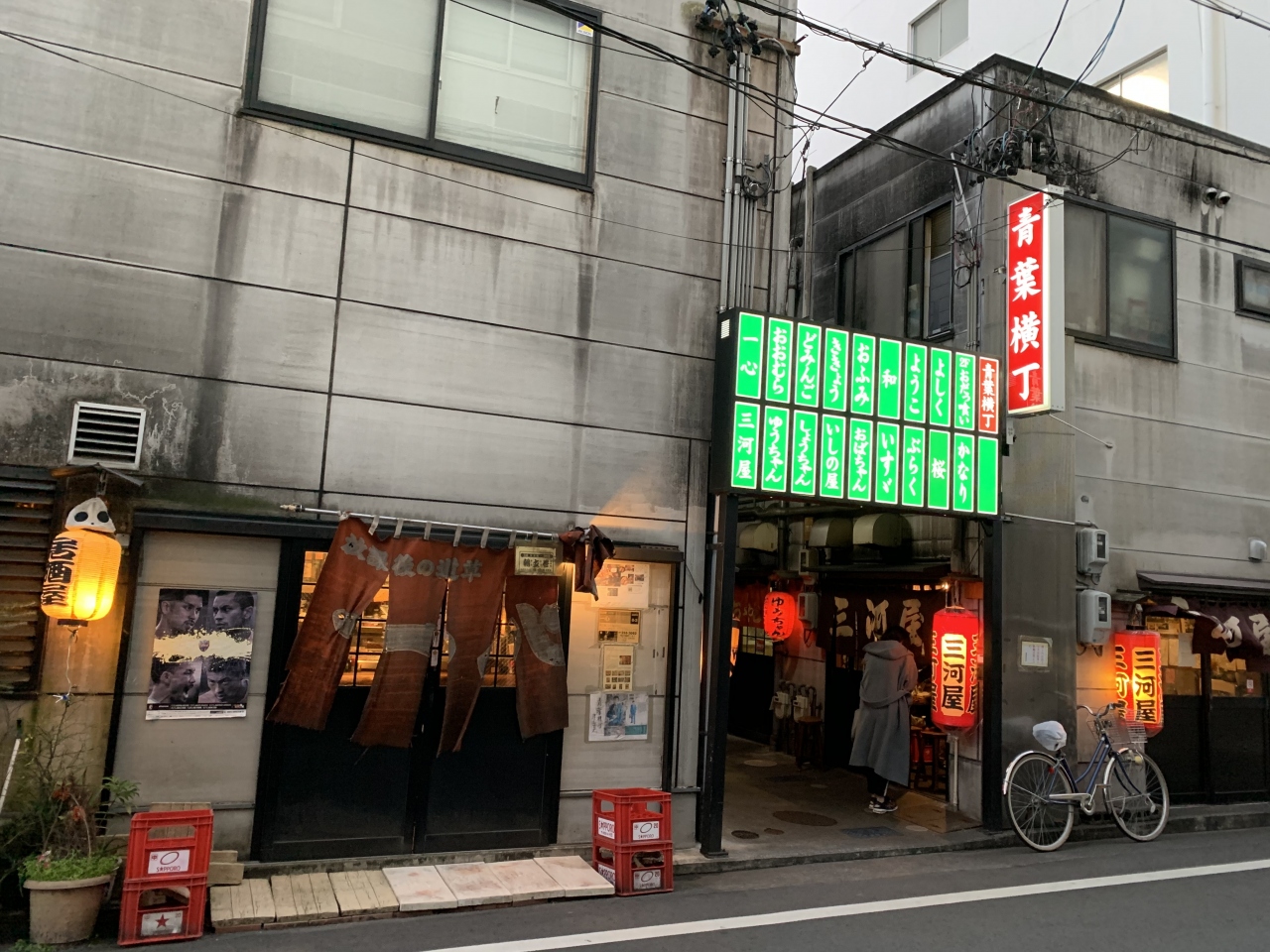 駅周辺から歩いて10分ほど、昭和通りを挟む「青葉おでん街」と併せて静岡おでんの店が密集するエリアです。この青葉横丁の「三河屋」さんを訪れてみました。基本的には予約制の店ではないですが、人気の店で遠方からでもあるので、かなり前から相談し予約を入れておきました。屋台から始まったような小さな店に、お客さんがひしめき合って座り、知らないお客さんとも会話が始まります。そんなお店が並ぶ横丁です。