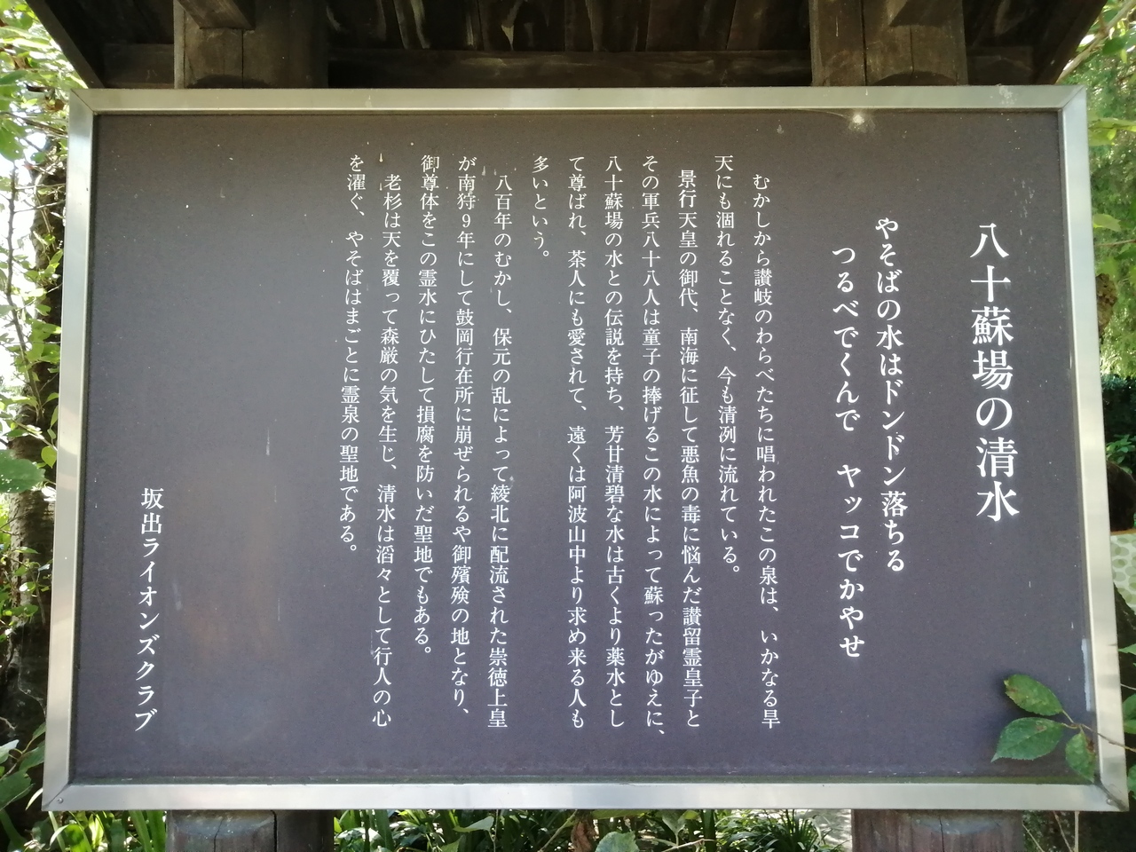 坂出に伝わる悪魚退治の伝説に登場する霊水が湧き出ています。悪魚の毒気に倒れた八十八人の兵士がこの水を飲んだことで息を吹き返したという言い伝えがあります。