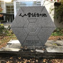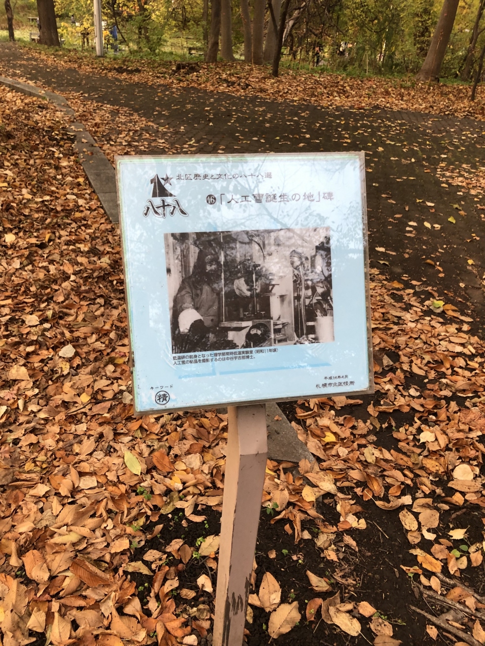 今や、スキー場などでお馴染みの人工雪が日本で誕生したとは知りませんでした。昭和11年に北大の研究室で誕生したそうで、北大内の研究室があった場所に碑が設置されていました。大野池の近くです。雪の結晶の形をした碑が偉業を称えています。