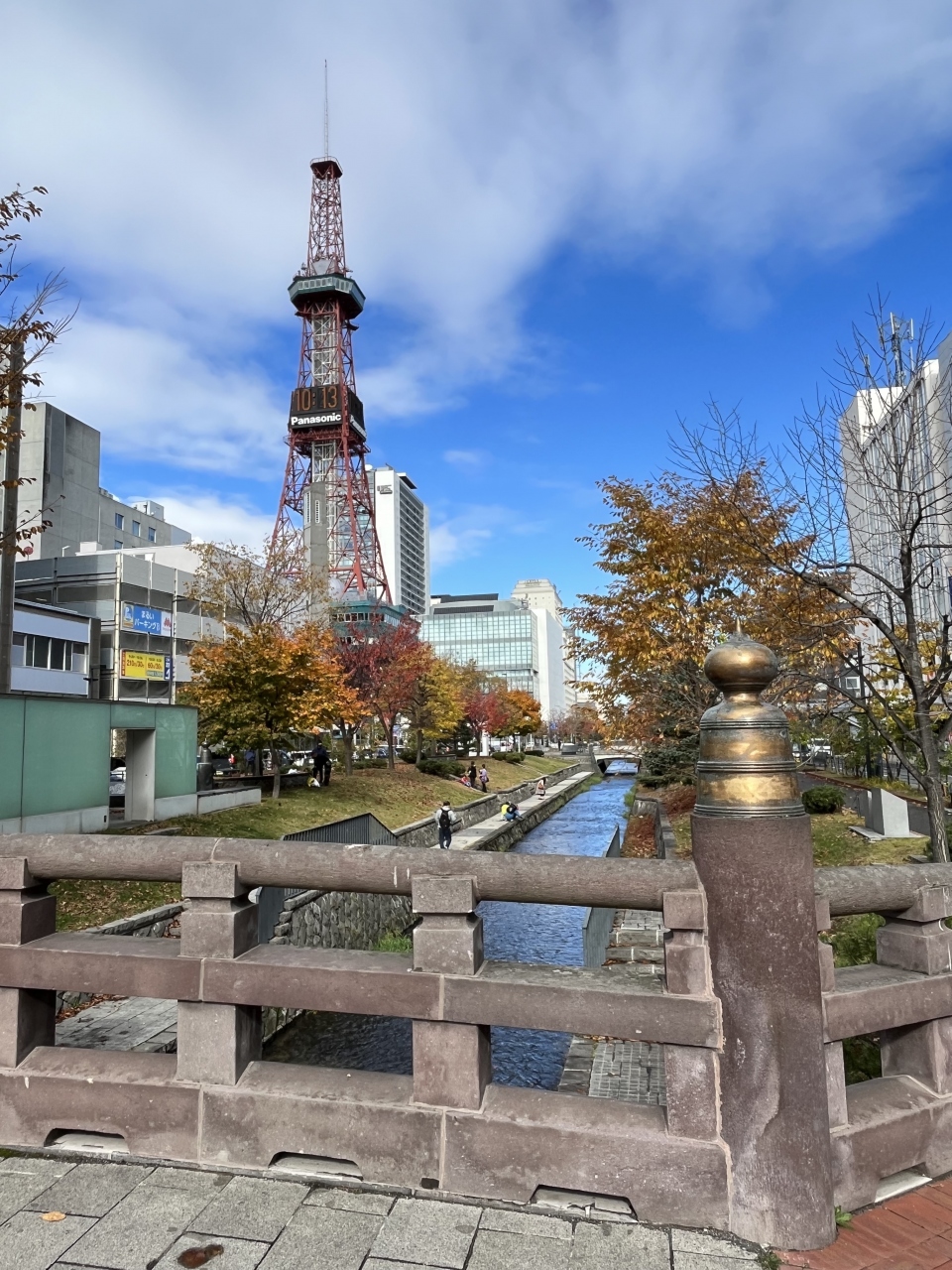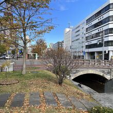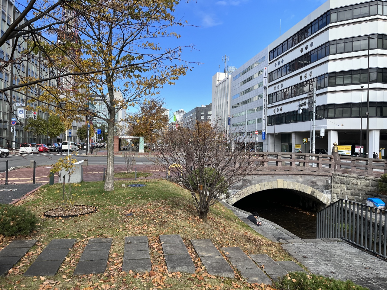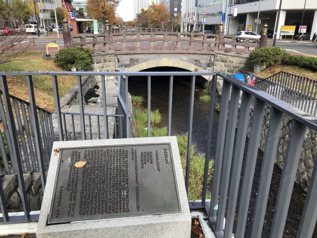 創成川に架かる橋です。元々の橋は明治43年に架けられ、その後の解体を経て、現在のものは平成になってから復元されたそうです。石造りの外観や擬宝珠など、歴史を感じる橋で、当時の雰囲気がわかるようにうまく復元されていると思いました。