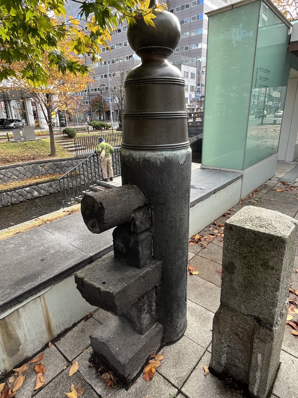 近くにある大友亀太郎像の隣には、創成橋の親柱と建設当時の擬宝珠が保存されているので、こちらも立ち寄るのがお勧めです。