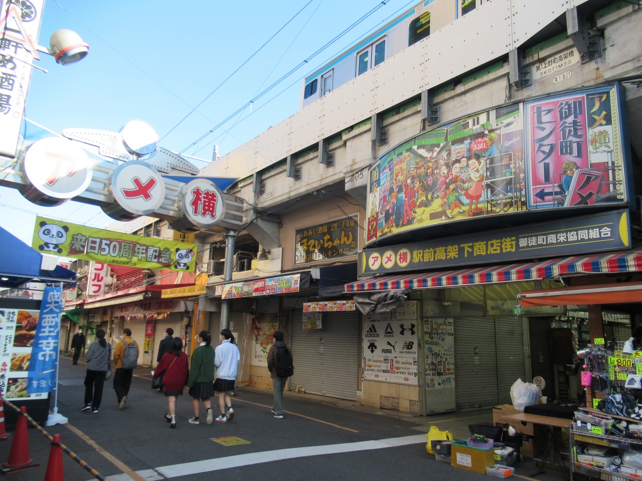 高架橋は観光施設ではありません。しかし東京駅と上野駅間の高架橋が完成したことで、100年近く前に山手線が環状運転されるようになり東京の近代化が進んだことを考えると、高架橋は貴重な歴史遺産と言えます。この高架橋もその一つで、御徒町駅側のアメ横入口に架かっています。橋の下にはゴルフショップや飲み屋が建ち、いつ訪れても多くの人が行き交うアメ横沿いに造られています。