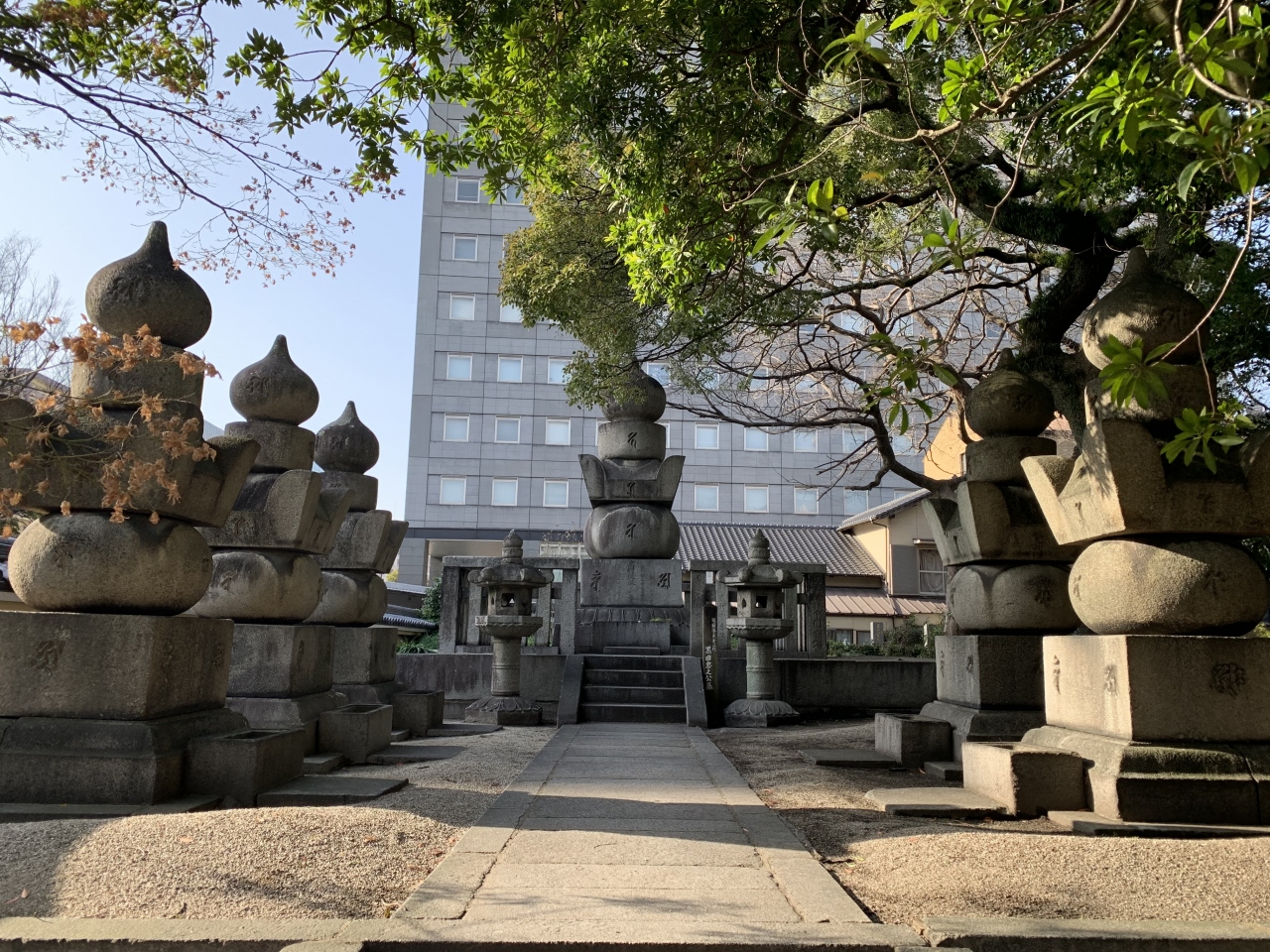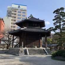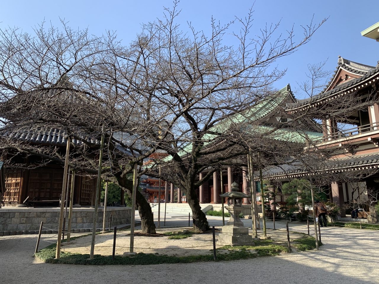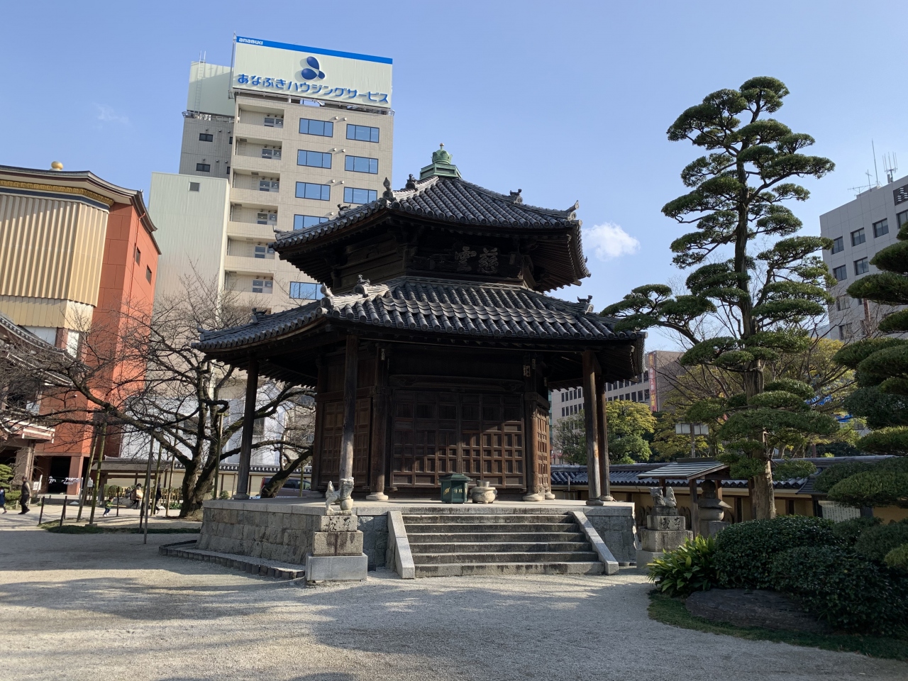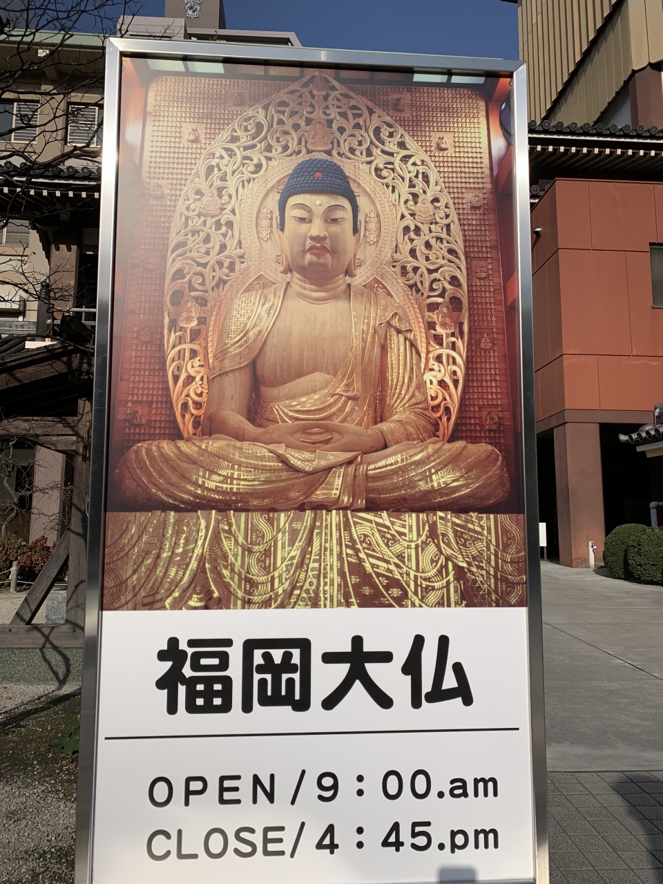 大博通り沿いの寺です。寺伝では大同元年(806年)、唐から帰国した弘法大師が海辺の地に一伽藍を建立、近世になって戦禍で焼失し二代福岡藩主黒田忠之が現在の地に再建したそうです。結構大きな寺で「五重塔」が美しく、黒田家の墓所でもあります。2階の大仏殿には、木造座像では日本最大級の「福岡大仏」があります。大仏の台座内には”地獄・極楽めぐり”が設置されており、真っ暗な通路を手すりをたよりにを進み「仏の輪」に触れるという、こう言ってはアレですが少しアミューズメントチックな体験でした。大仏は撮影禁止なので表の看板を。