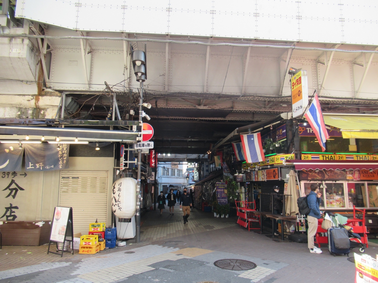 御徒町駅から上野駅に向かって、高架橋や架道橋を巡りながら散歩していた際に立ち寄った架道橋です。上野駅不忍口から100mほど、橋の下には明治4年創業のもんじゃ焼き店・もへじ分店や、タイ料理の店、居酒屋などが建ち並び、アメ横らしい活気が感じられます。