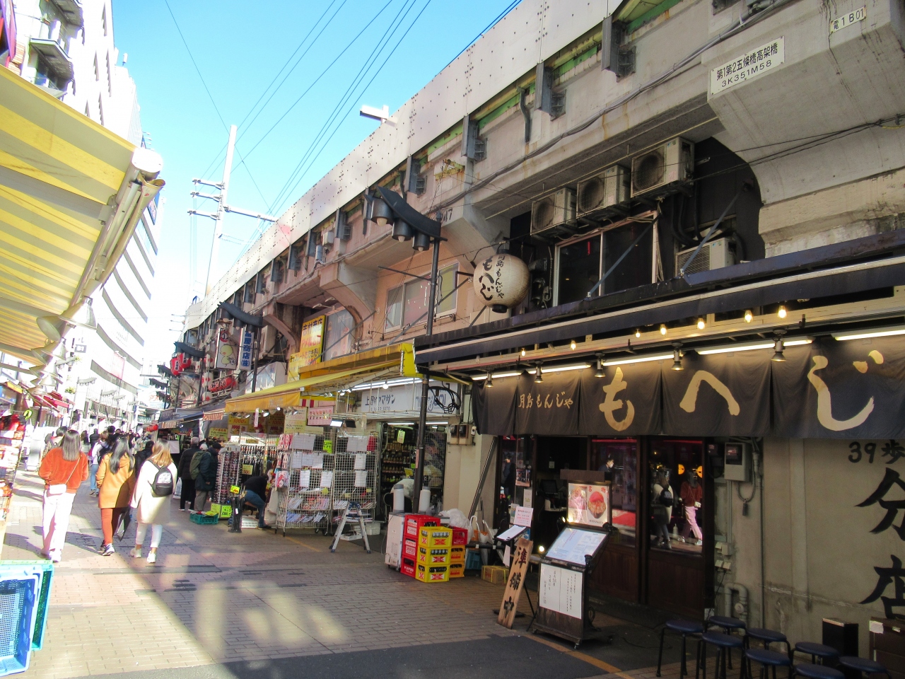 高架橋は観光施設ではありません。しかし東京駅と上野駅間の高架橋が完成したことで、100年近く前に山手線が環状運転されるようになり東京の近代化が進んだことを考えると、高架橋は貴重な歴史遺産と言えます。この高架橋もその一つで、上野駅不忍口から100mほどのアメ横商店街沿いに架かっています。橋の下には明治4年創業のもんじゃ焼き店・もへじ分店や、土産店、アクセサリーやバッグを売る店などが並び、活気と歴史が感じられます。