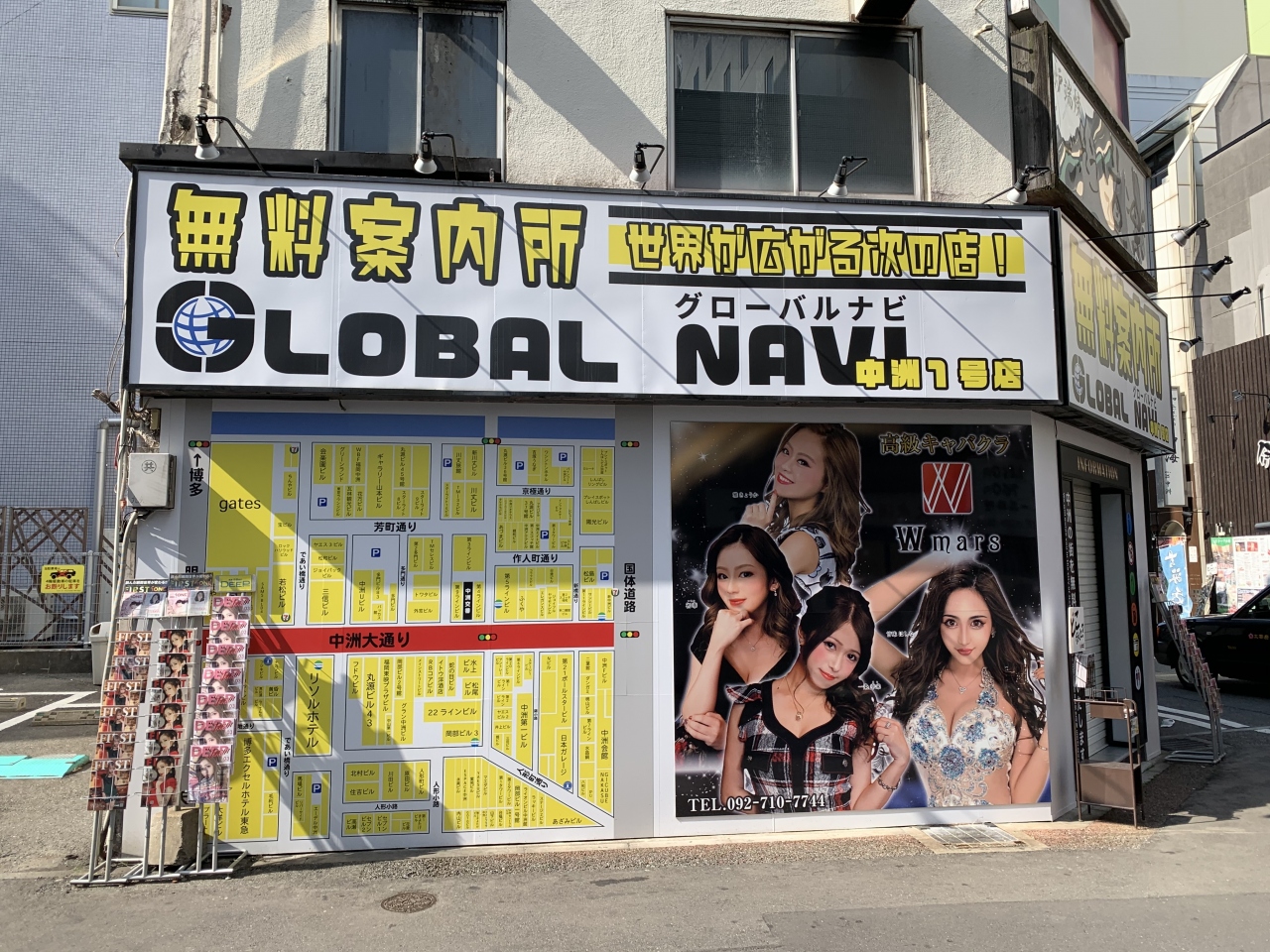 中州と西中洲をつなぐ、那珂川に架かる橋です。画像ではわかりにくいですが、上から見ると円が二つあり中州側は二股に分かれているという変わったデザインの橋です。「であい橋」という名前の由来は、男女の出会いではなく城下町福岡の武士と博多の商人が出会いを含んでいるらしい。中州へ渡り切ると別の出会いを促す看板が…。中州で飲んだ後に那珂川沿いのネオンを眺めるのもアリです。