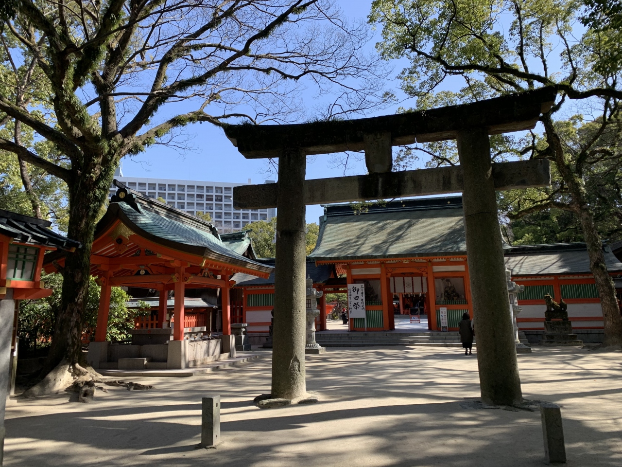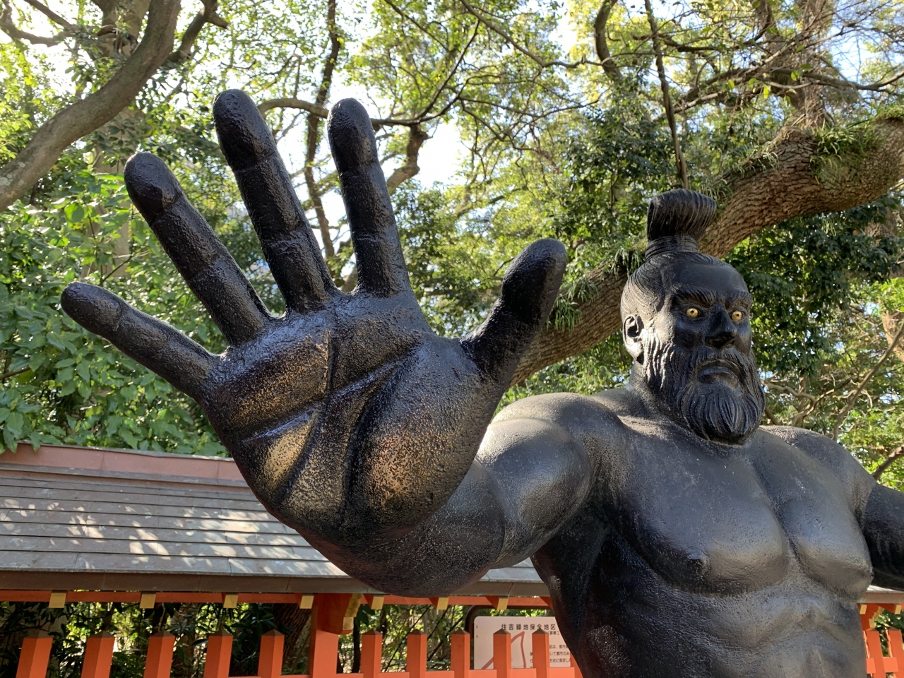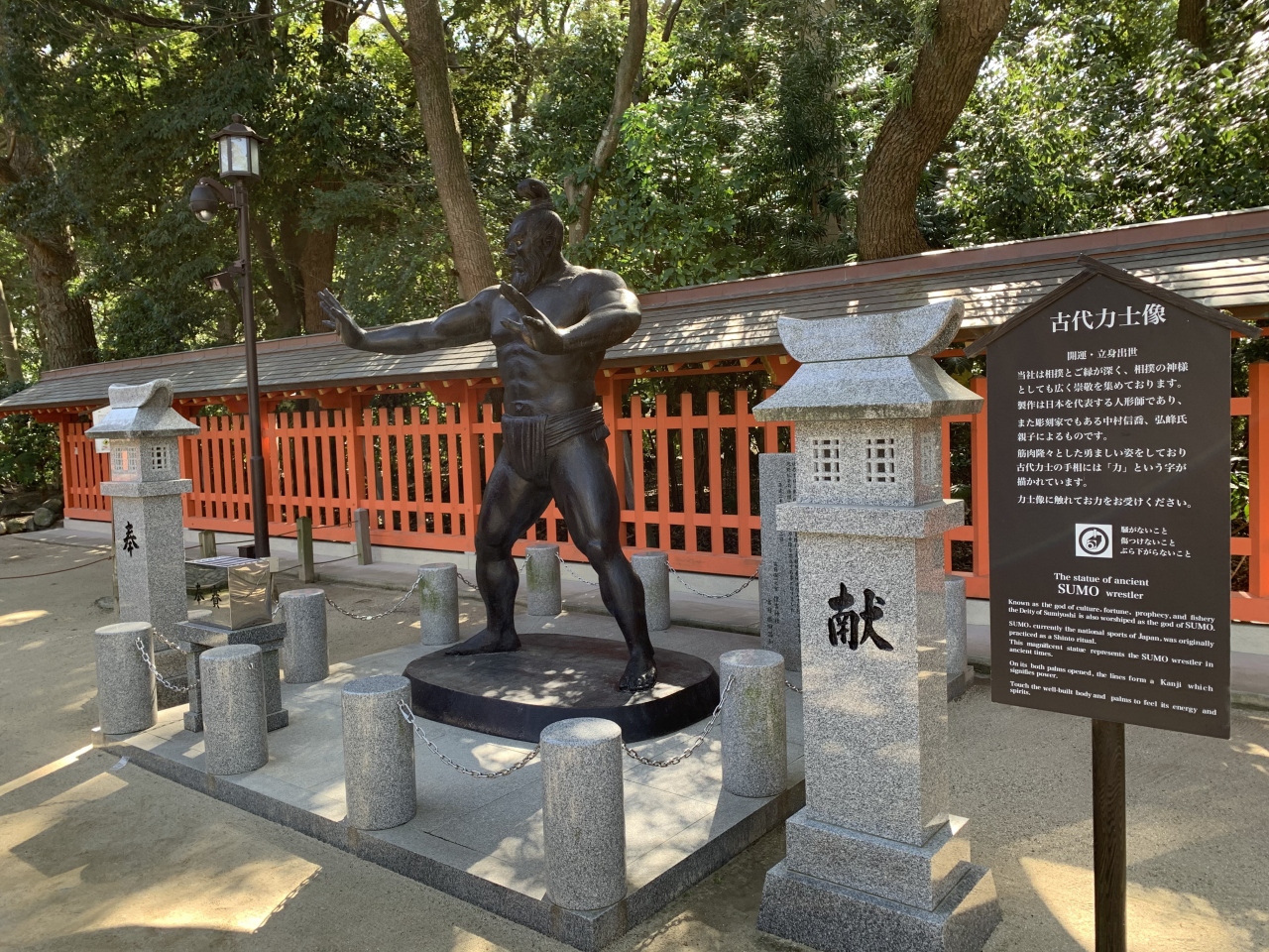 那珂川の東岸、住吉にある「住吉神社」へ。西門から表参道を通り「二の鳥居」と「神門」をくぐって拝殿へ。この神社は千八百年以上前には存在していた記録があり、全国に2129社ある住吉神社の最初の神社と言われているそうです。元和九年(1623年)に、黒田長政により再建されたという「本殿」(国重文)をお参り。境内にあった古代の力士をかたどった像は、博多人形師による作品とのこと。右手に「力」文字のシワ。水鏡天満宮と同様に都会の真ん中に佇むオアシス的な神社です。