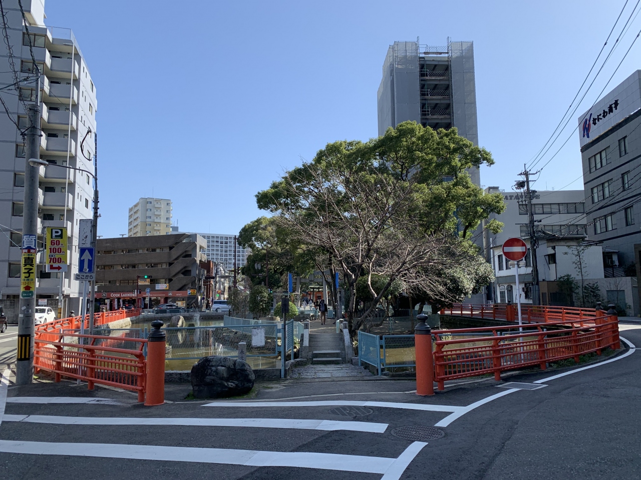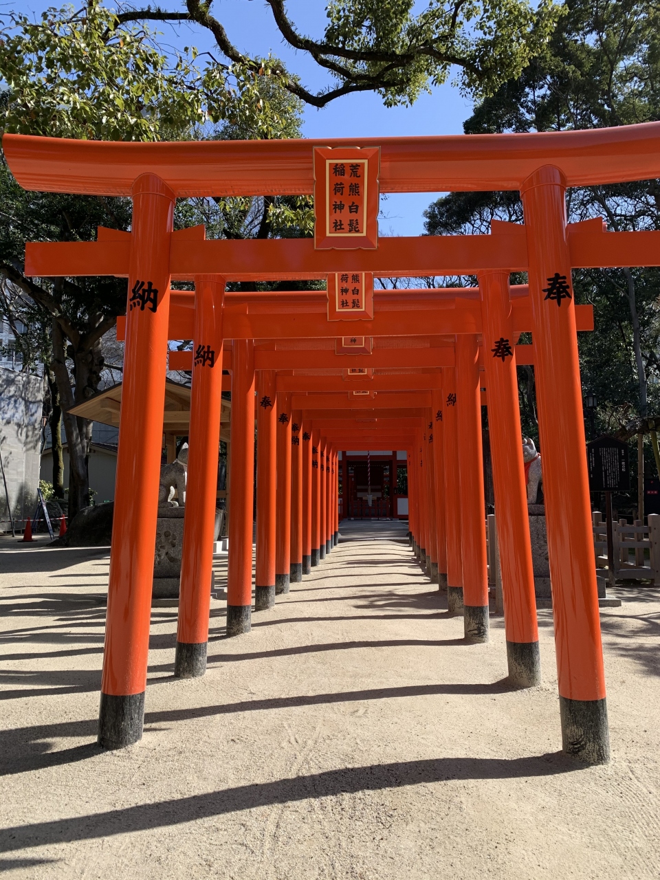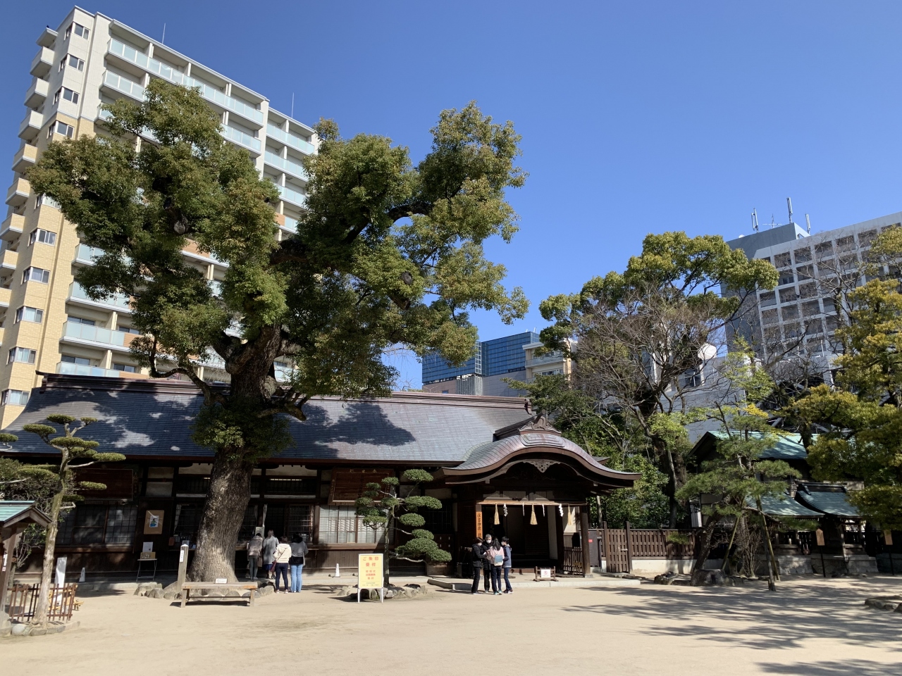 那珂川の東岸、住吉にある「住吉神社」へ。西門から表参道を通り「二の鳥居」と「神門」をくぐって拝殿へ。この神社は千八百年以上前には存在していた記録があり、全国に2129社ある住吉神社の最初の神社と言われているそうです。元和九年(1623年)に、黒田長政により再建されたという「本殿」(国重文)をお参り。境内にあった古代の力士をかたどった像は、博多人形師による作品とのこと。右手に「力」文字のシワ。水鏡天満宮と同様に都会の真ん中に佇むオアシス的な神社です。