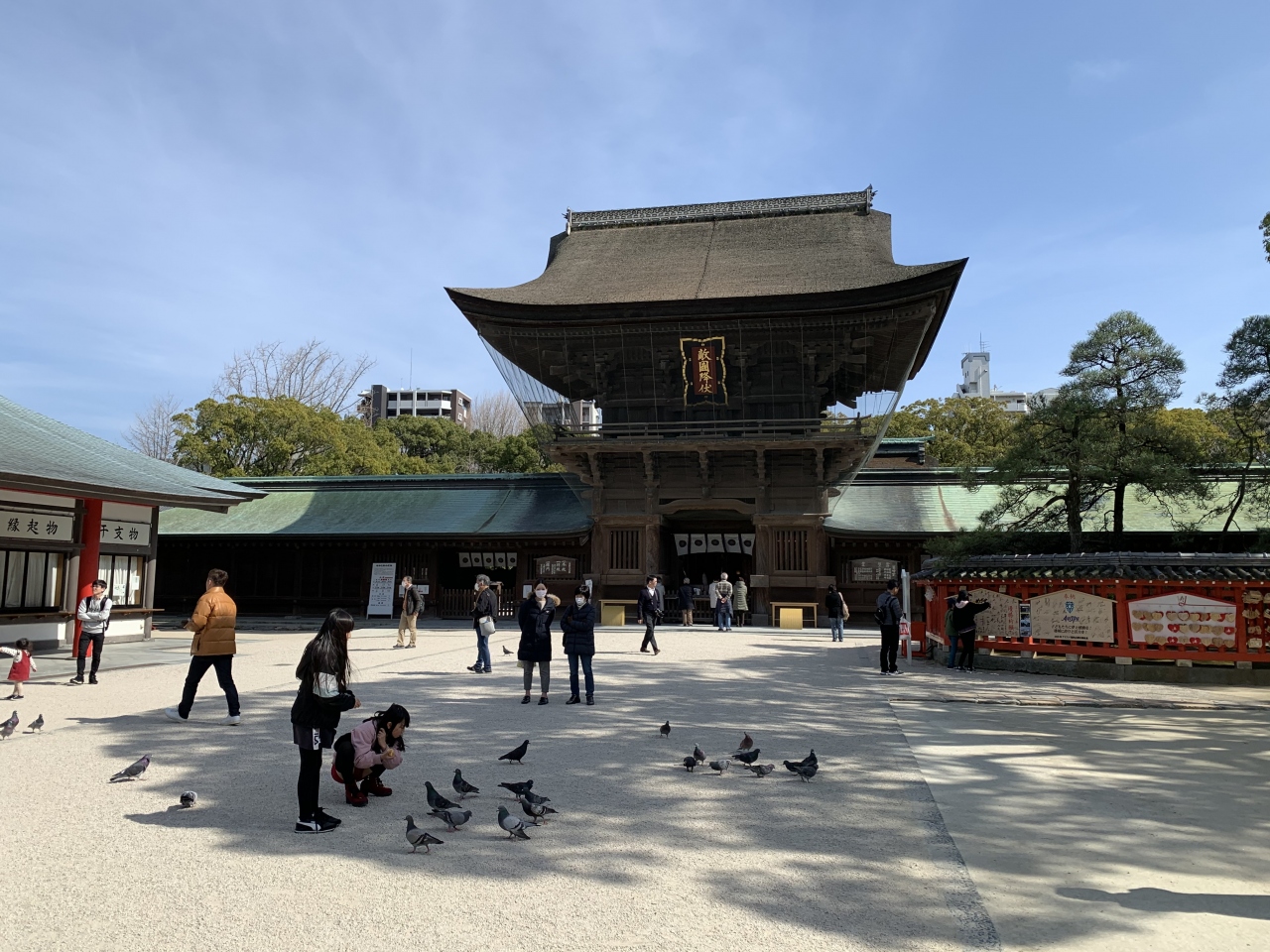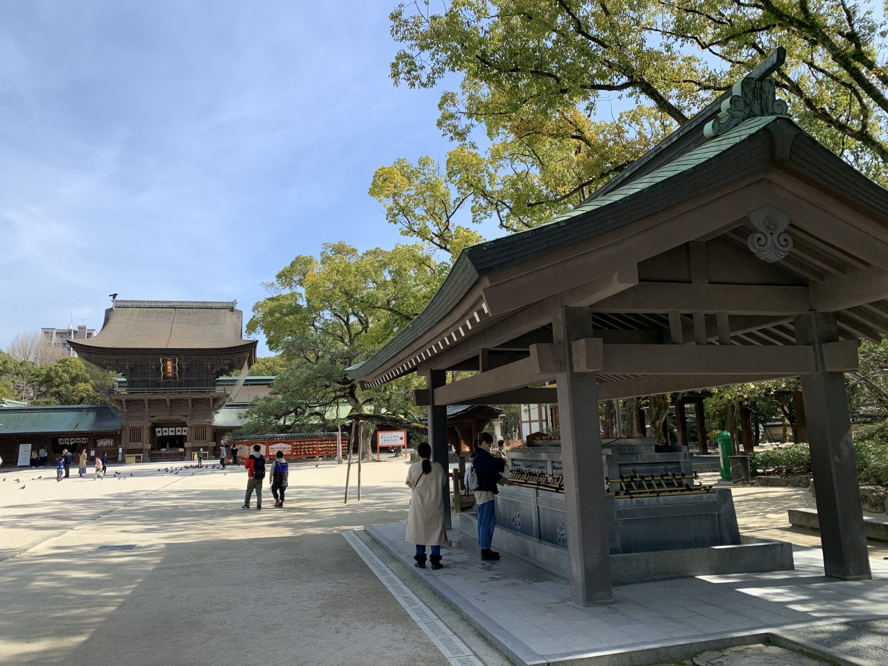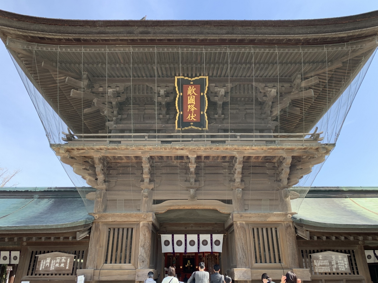 中洲川端から地下鉄に乗り東区の箱崎宮へ。ここに「筥崎宮(はこざきぐう)」があります。延長元年(923年)創建とされる古刹です。楼門には「敵国降伏」の文字、元寇の際に亀山上皇が祈願して掲げたそうで、それ以来海上交通・海外防護の神なのだそうです。拝殿では何かの催し中で、入るのがはばかられる状況でしたので、外から拝観しました。「木像亀山上皇御神像」は、蒙古襲来の際に「我が身を以て国難にかわらん」と敵国降伏の祈願をし、博多の街の安寧を祈願した亀山上皇を顕彰し、明治37年(1904)完成した銅像の原型となる木彫像。福岡県出身の彫刻家・山崎朝雲によるもの。触れると運が湧き出るといわれる「湧出石」などもあり。郊外にあるだけにゆったり広い神社で、ハトの餌販売機があったりしてこれを買えば堂々と鳩のエサやりを楽しめます。