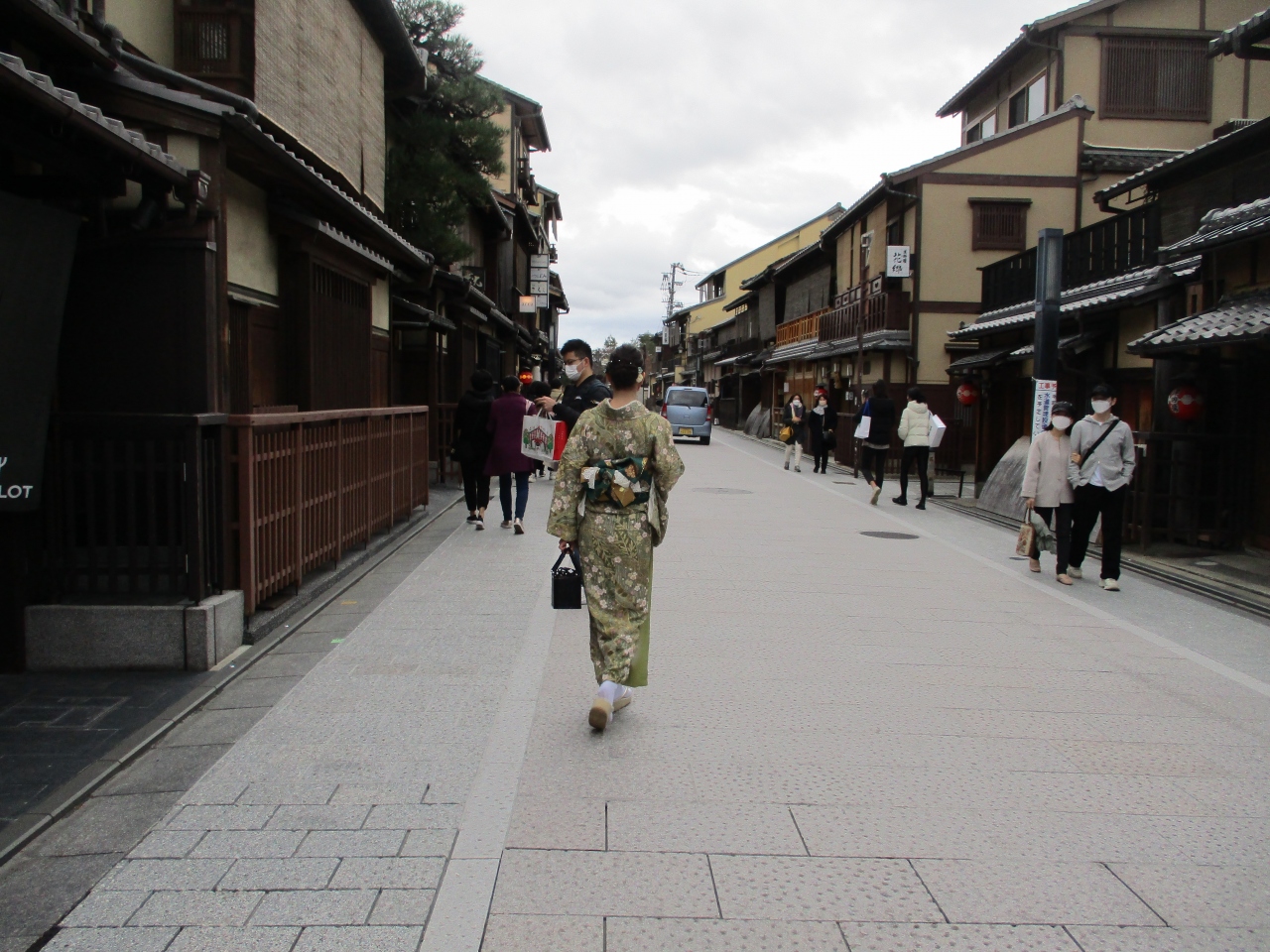 建仁寺の紅葉を見に行くのに花見小路を通っていきました。幅が広めの石畳の道の両脇にお茶屋や料亭が並んでいます。京都らしさが感じられる小路です。観光客に人気のスポットで着物で散策する人も見かけました。写真映えしそうです。マナーについての看板があちこちにありました。