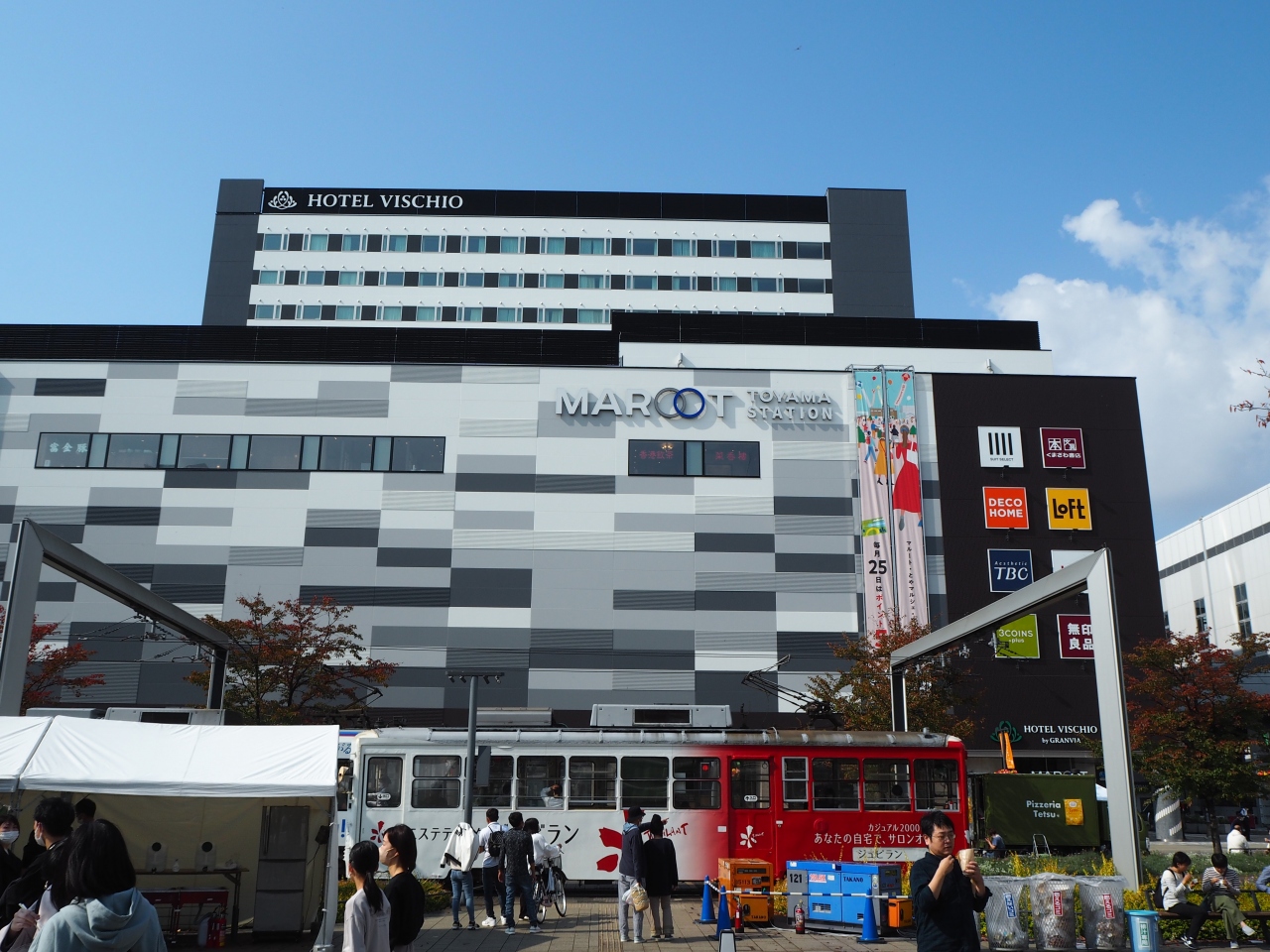 マル―トは富山駅の駅前広場にある商業施設で、上の階にはホテルが入っています。2022年にオープンした施設で、おしゃれ感がある建物になっています。商業施設には無印良品やロフトなどのお馴染みの店が入っています。また1階には光岡自動車のショールームがあります。車好きには立ち寄りたい場所です。