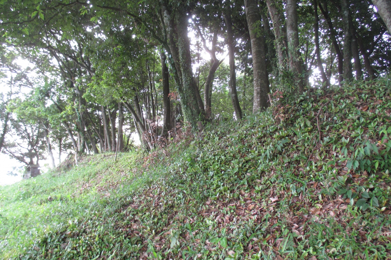 ツツジの大原公園の上は広場になっていて、東端には慰霊塔が建っていますが、反対の西端の公衆トイレの横の下り坂を降りたところに竜ヶ鼻古墳がありました。小振りな前方後円墳で、降りたところが後円部で、案内板が立っていました。全体は形がかなり崩れてしまっていますが、全長は約35mです。後円部は径が約18mで、高さが約3m、前方部は長さが約17mで、高さが1.5~2mです。築造は5世紀後半とみられるそうです。小型の古墳ですが盗掘に遭っているそうですね。後円部の上が窪地になっているところがその跡だとか・・・。前方部の上には小さな石祠が置かれていました。なお、ここは個人の所有だそうです。