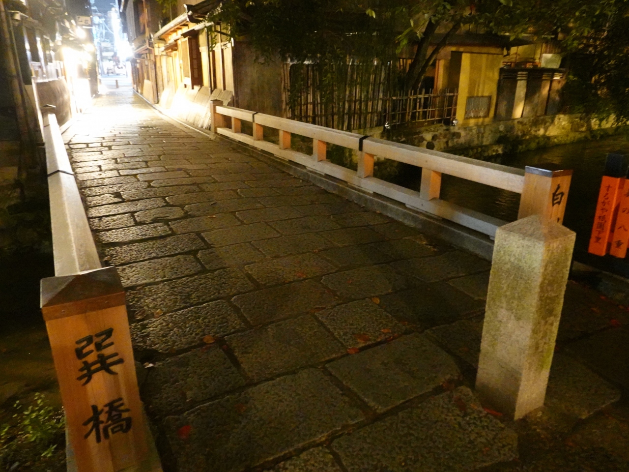 京都の祇園エリアを流れる白川に架かる橋のひとつが「巽橋」です。雑誌やテレビなどでも巽橋周辺の光景は度々紹介されています。夕食後に訪れたので人の姿は少なく静かでした。石畳に反射する灯かりに京都らしい情緒を感じました。桜の咲き誇る季節にも訪れてみたいですが、混雑は必至だと思います。