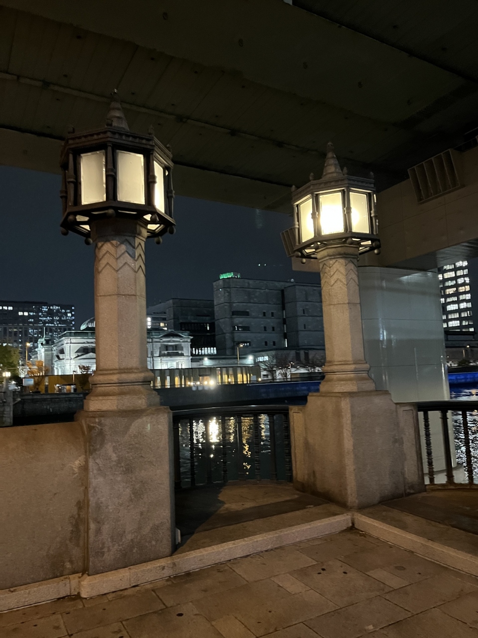 淀屋橋の大阪寄りにある橋で、レトロな街灯があり、夜はとても綺麗です。しかし、御堂筋イルミネーションのシーズンは、なんと、大江橋の上から華麗にそして美しくライトアップされた中之島公会堂が見えました。もうウットリですよ。