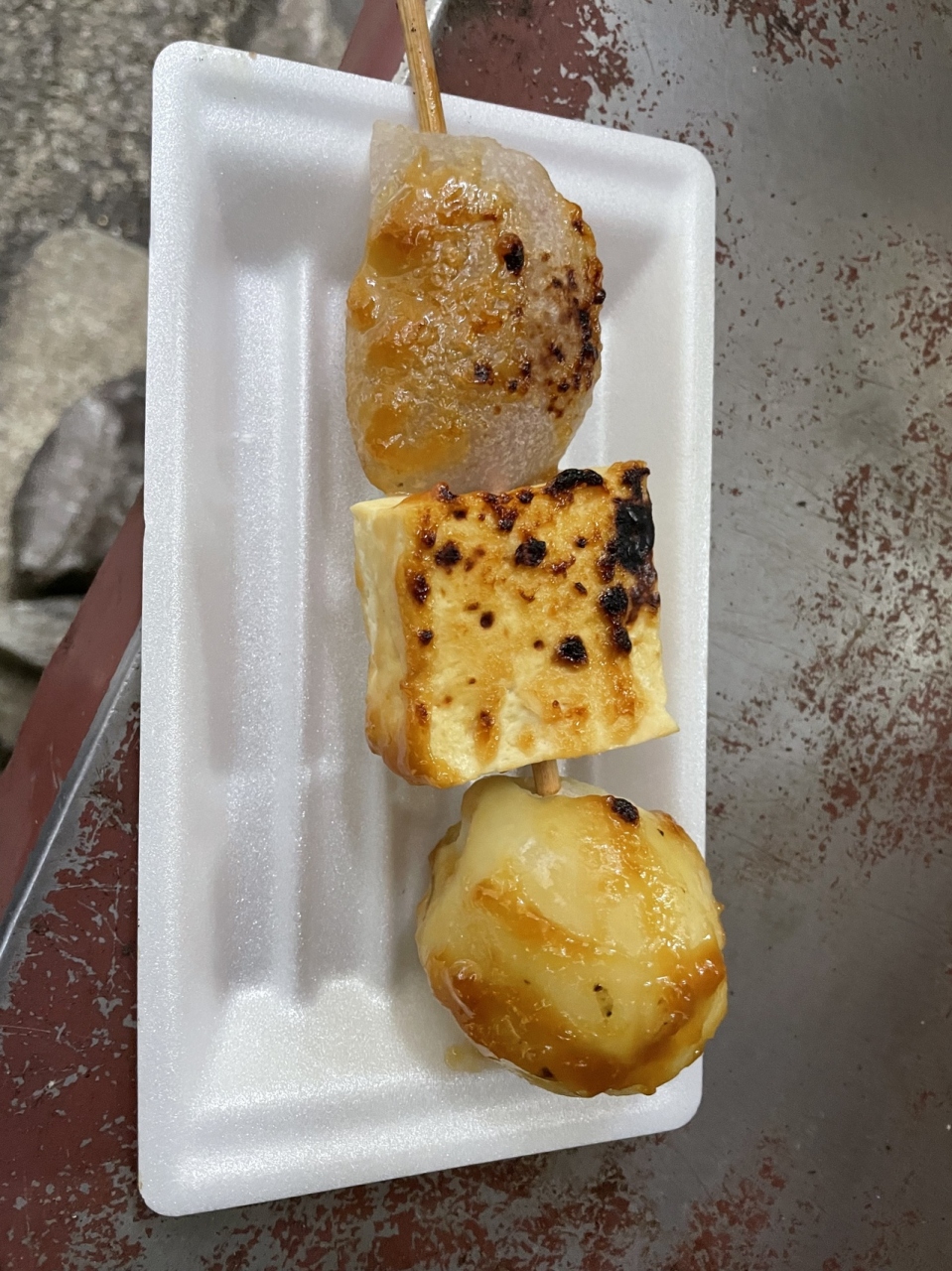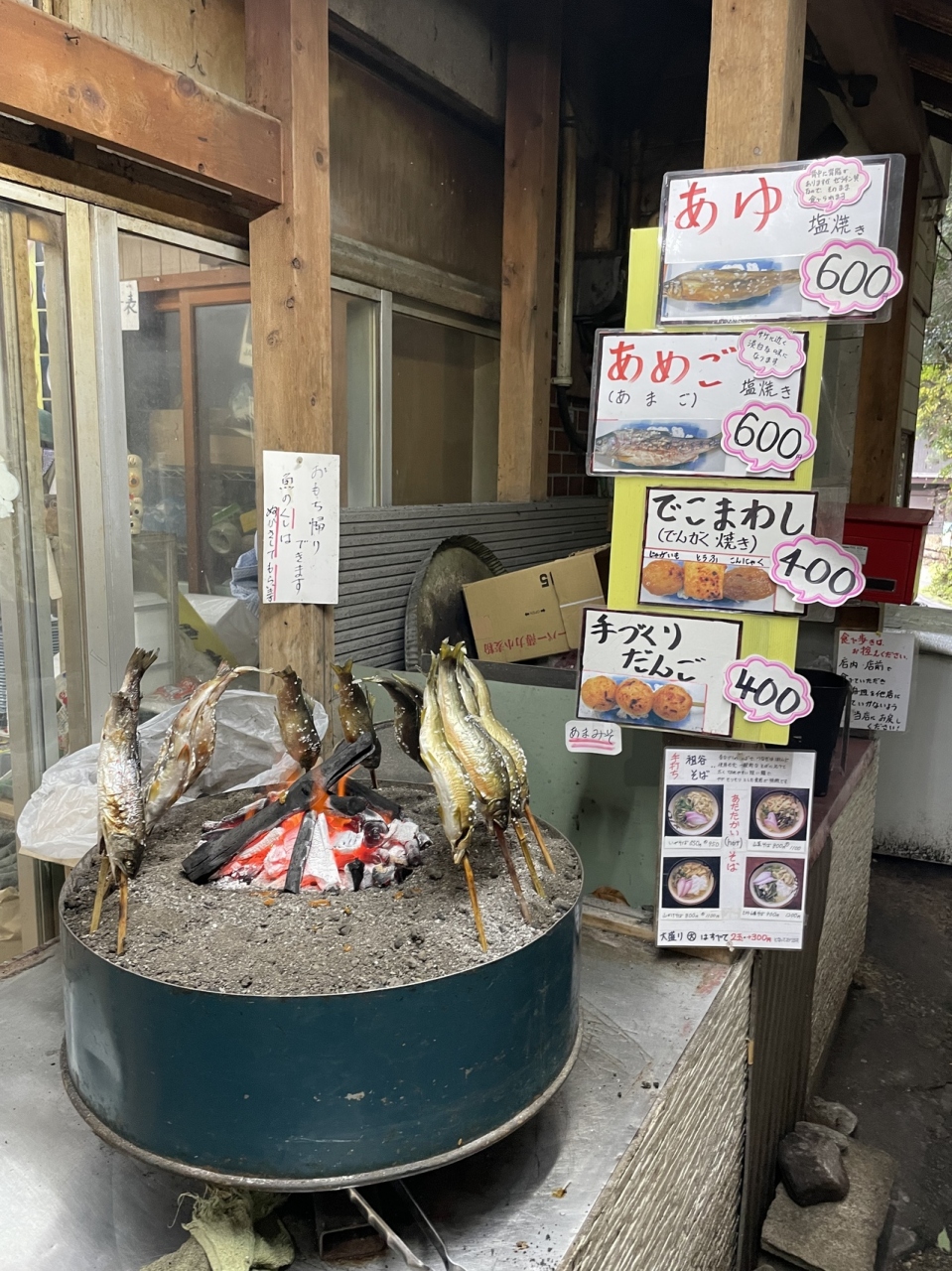 道すがらにアユやアメゴ(ヤマメ)の塩焼き、郷土料理の味噌を塗って焼いた豆腐やじゃがいもの田楽「でこまわし」のお店が有り、祖谷の味を楽しめました。