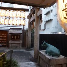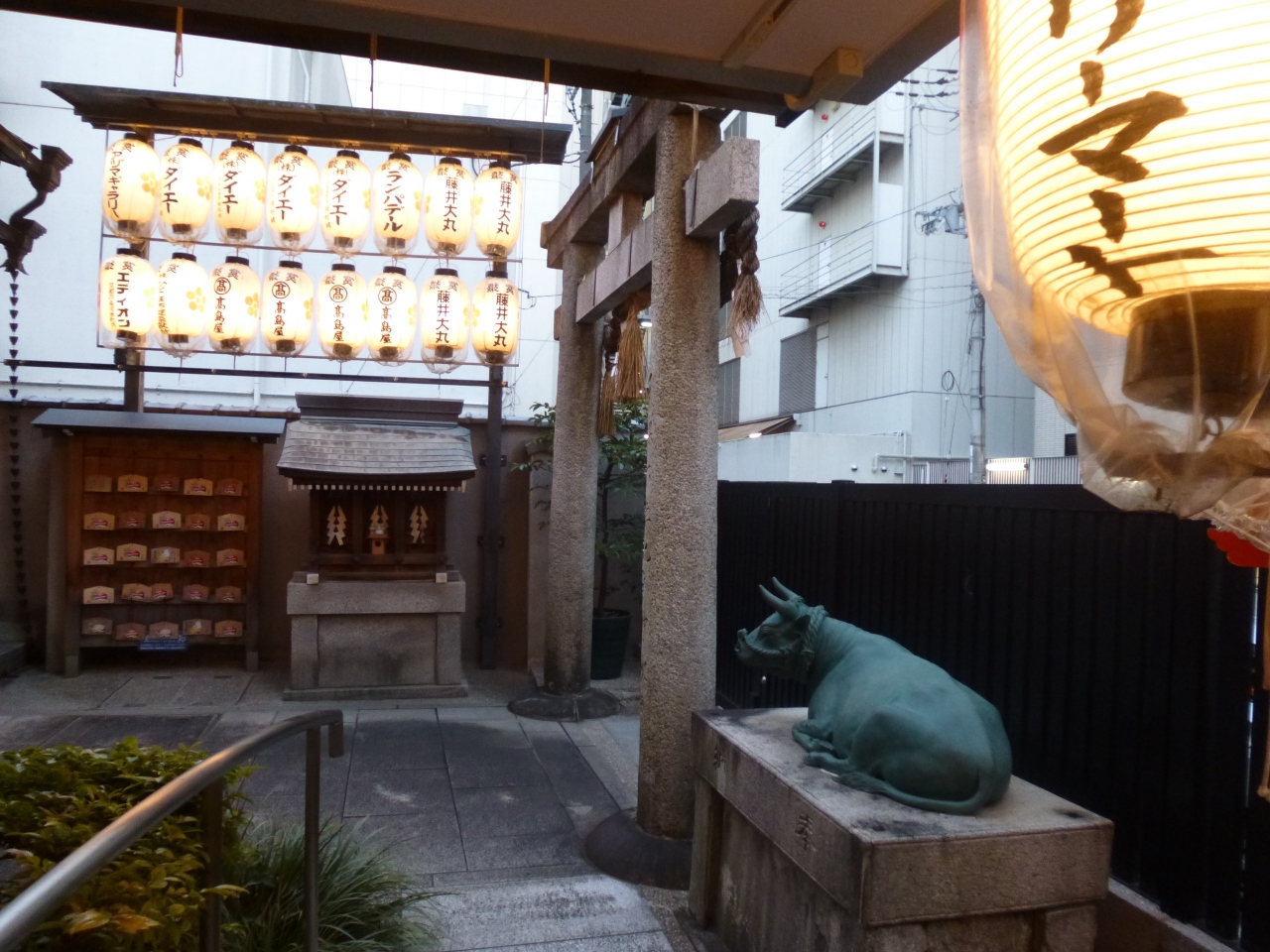 四条通から寺町通に入り少し南に進んだところにあります。16世紀末に創建された神社で1597年に現在の場所にあります。今はビルの脇に小さな鳥居があり、石畳の道を奥まで進むと本殿があります。また天満宮だけあり、境内の近くにはなで牛の姿もありました。小さいながらも存在感のある神社です。