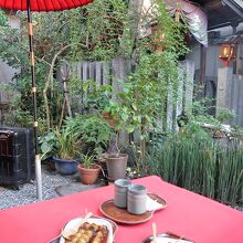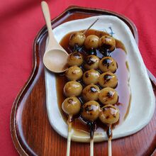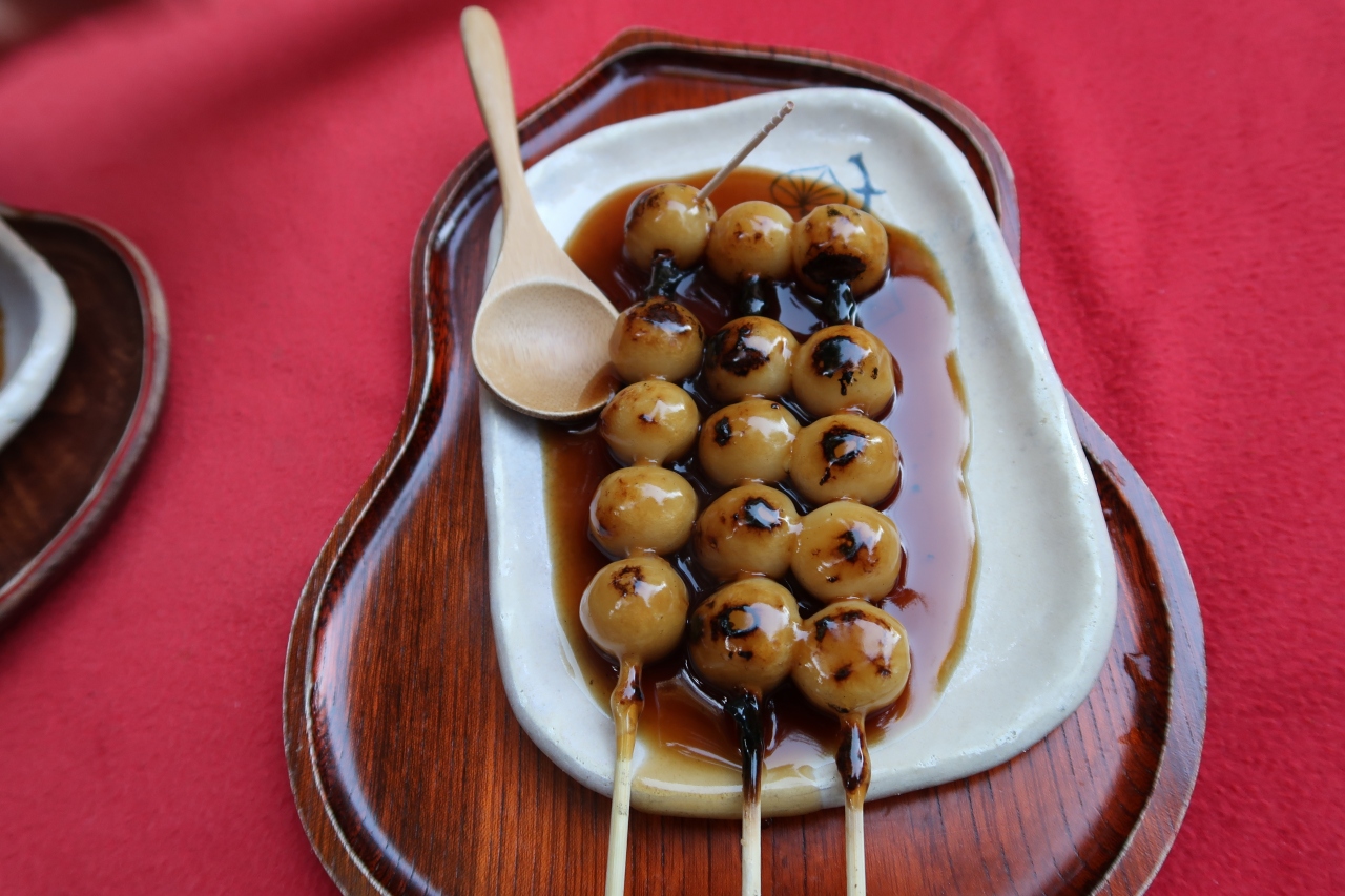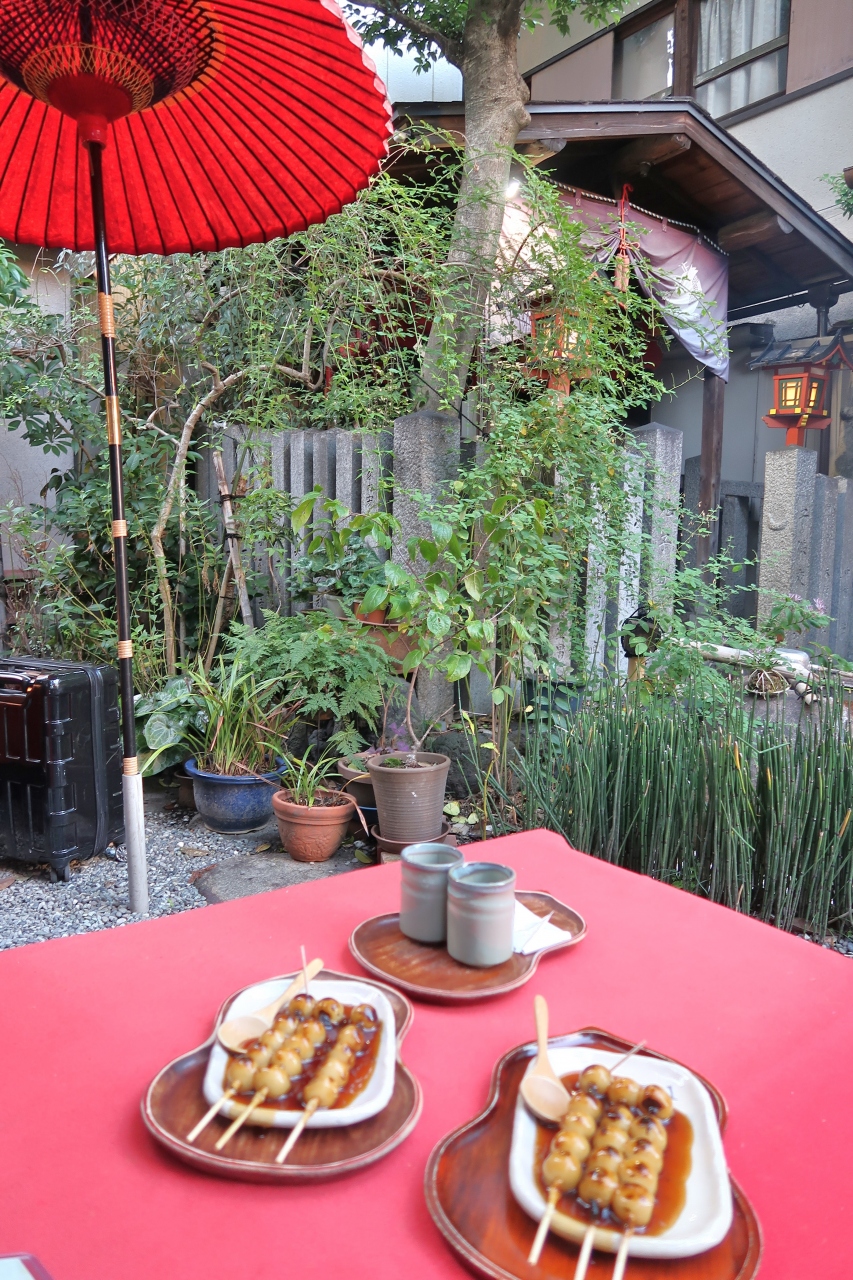 みたらし団子とは、下鴨神社、御手洗社のみたらし池にぷくぷくと湧き出す水の泡を、お団子で表現したもので、平安時代から令和時代まで親しまれている歴史あるお菓子!休憩も兼ねて参拝後に立ち寄りました。夕方でも行列ができていて、20分ほど待ちました。鬼子母善神の祠があるお庭に案内されました。あたりには炭火と醤油の焦げるいい匂いが漂っていましたが、運ばれてきたみたらし団子も、炭のよい香りがして、あっという間に平らげてしまいました。昨今は、自分で焼くお団子屋さんもありますが、やはりプロに焼いてもらったお団子の方がずっとおいしかったです。