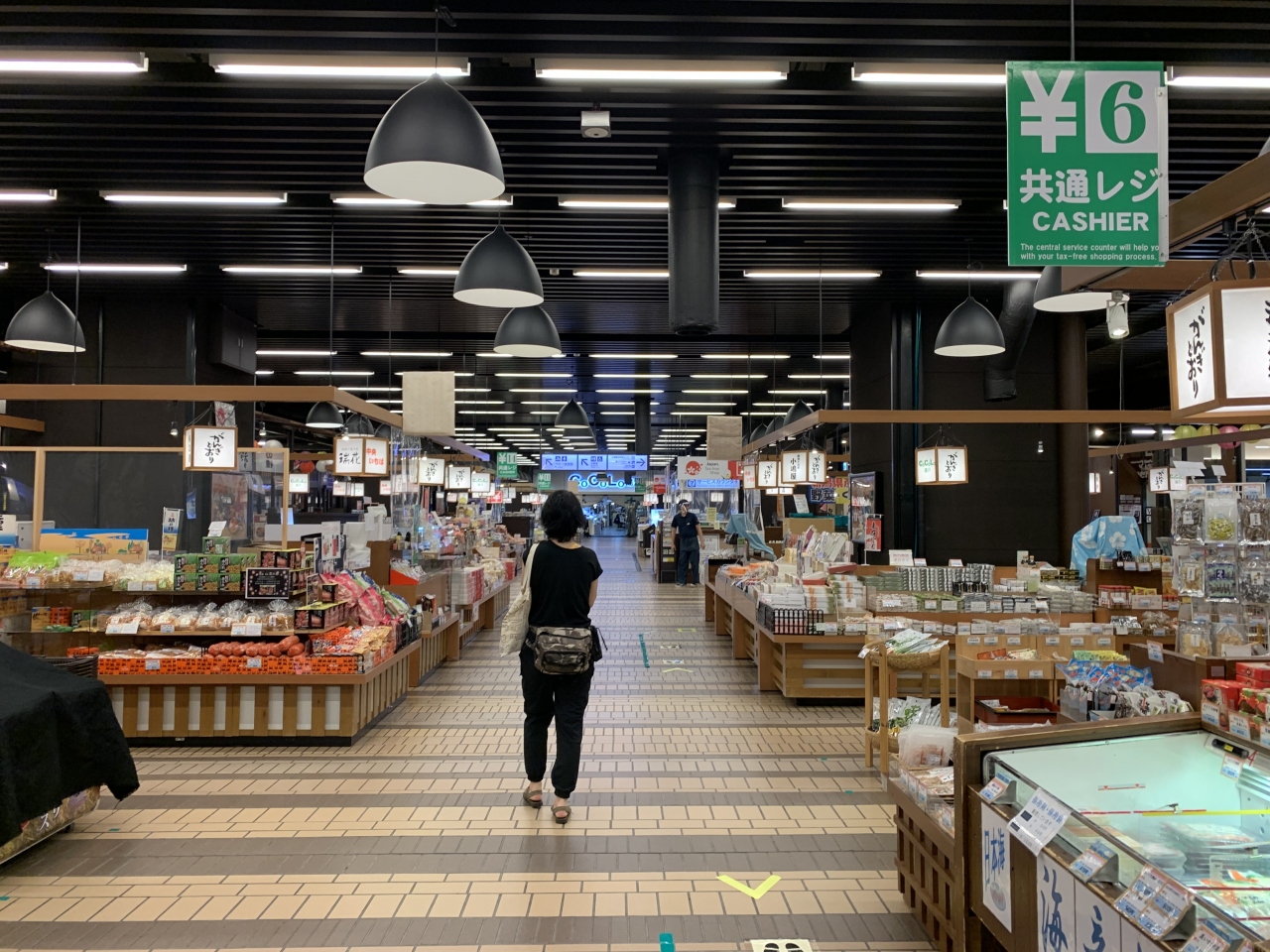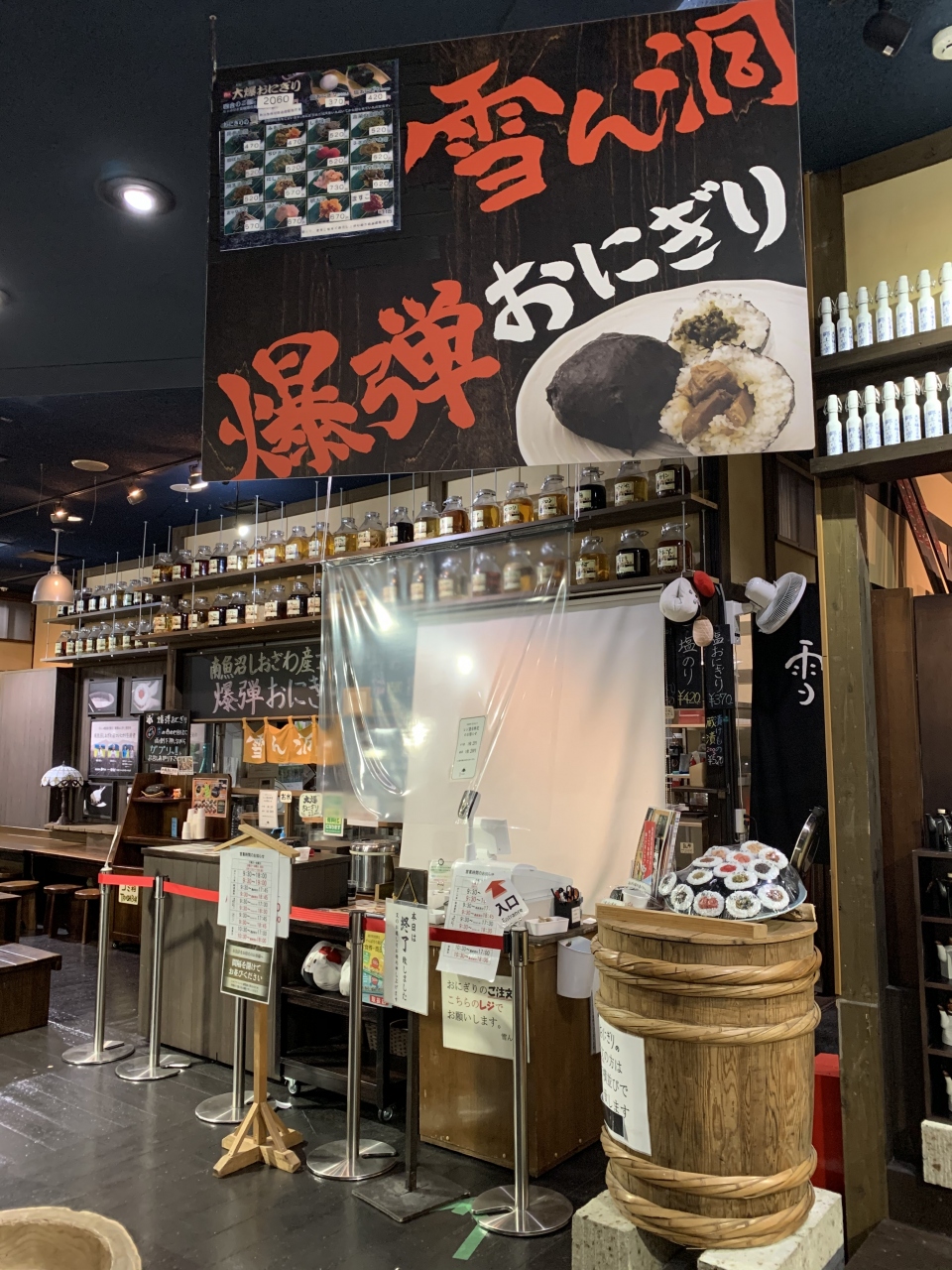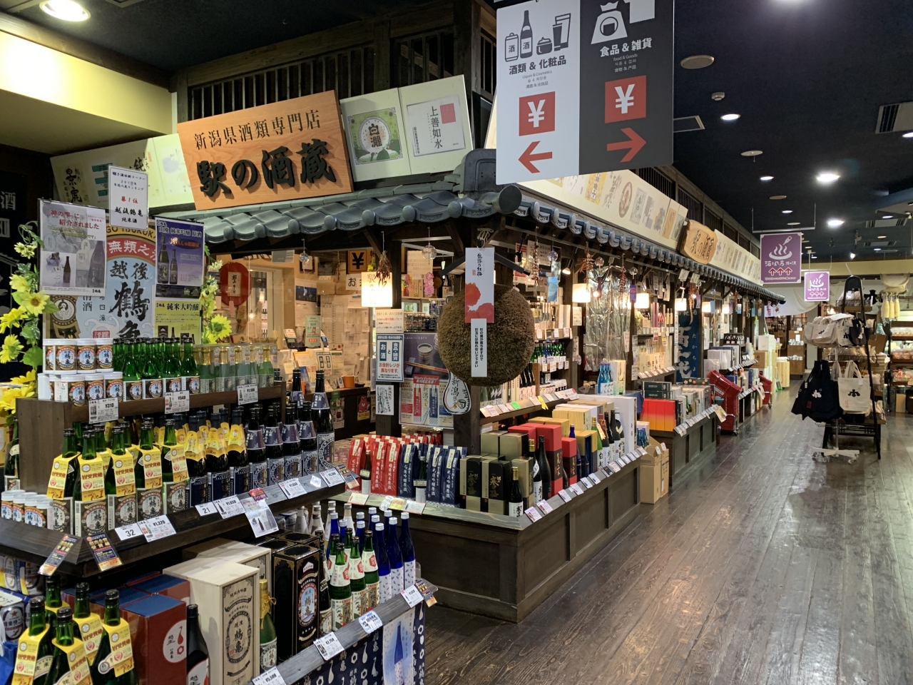越後湯沢駅の駅ビルです。「がんぎ通り」という屋台っぽい店が並ぶ通りと一体になっているようで、一番大きな店舗は「ぽんしゅ館」です。ぽんしゅ館内では新潟の数ある日本酒の試飲ができます。試飲体験料500円を払うとメダル5枚とおちょこが供され、好きな日本酒を試飲できました。館内はお酒にちなんだ売り場も充実。爆弾おにぎりの「雪ん洞」もあります。