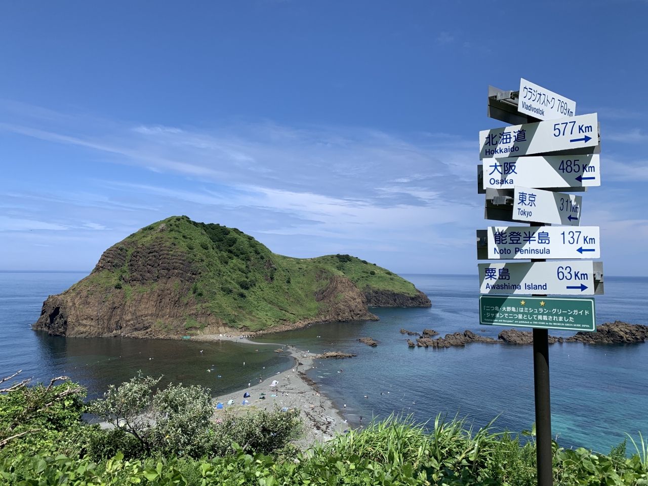 県道45号(佐渡一周線)北上した佐渡島の北端にあります。北端の岬に着くと、並んだ亀に見える”沖の島”と”磯の島”の「二ツ亀」が姿を現します。周辺の二ツ亀海水浴場の透明度は佐渡随一を誇り、「日本の快水浴場100選」にも選ばれているそうです。海岸まで下りると帰りは上りになるので意外と疲れます。夏は「SADO二ツ亀ビューホテル」で冷たいものでも飲みながら二ツ亀を眺めるのもおススメです。