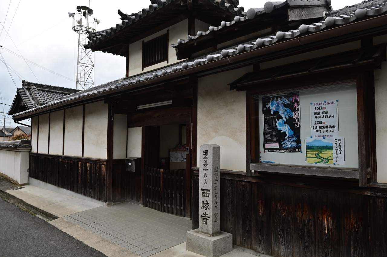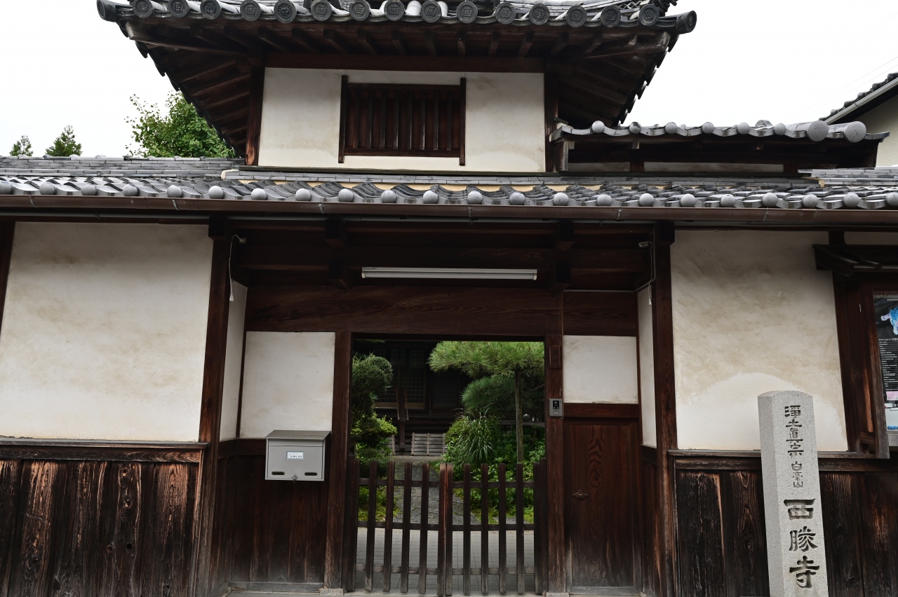 新薬師寺から白毫寺へ向かう道の途中で見つけた寺院だ。道に面して建つ鼓楼門がとても印象的な建築物で、門前には「浄土真宗 白毫山 西勝寺」という石碑が立っている。門には結界が置いてあり立ち入るのはやめたが、静かな周辺と相まってとても雰囲気のある寺院だ。