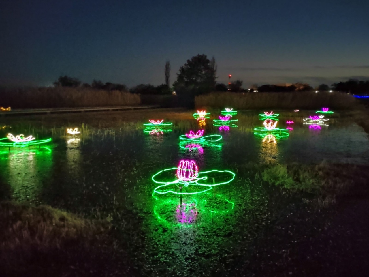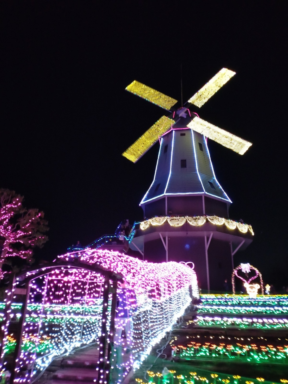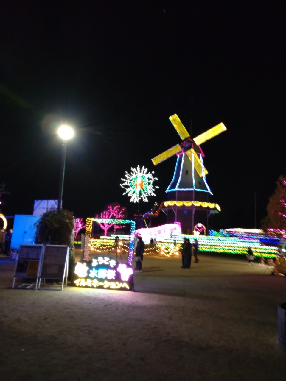 1月15日迄、17時~21時に公園の風車周辺でイルミネーションが見られます。平日でしたが風車に近い駐車場に停めるため16時過ぎに到着しましたが、駐車場は95%埋まっていました。車内で待つ人も居て停められ幸運でした。今年最後の満月も見られ、やや明るい時間に散策しながら点灯を待ちました。小さな会場ですが見応え充分、さらっと一回り30分、楽しい時間を過ごせました。