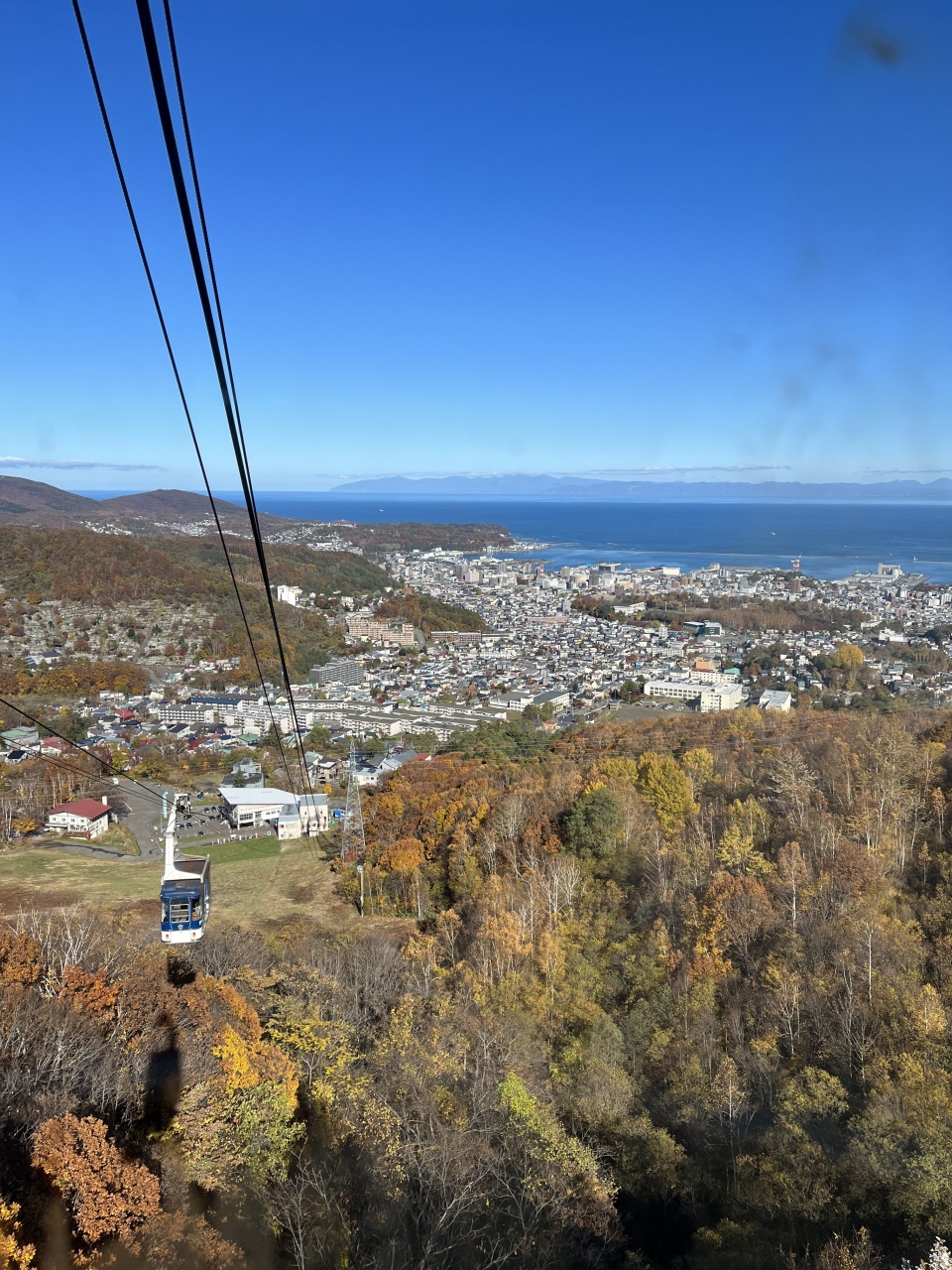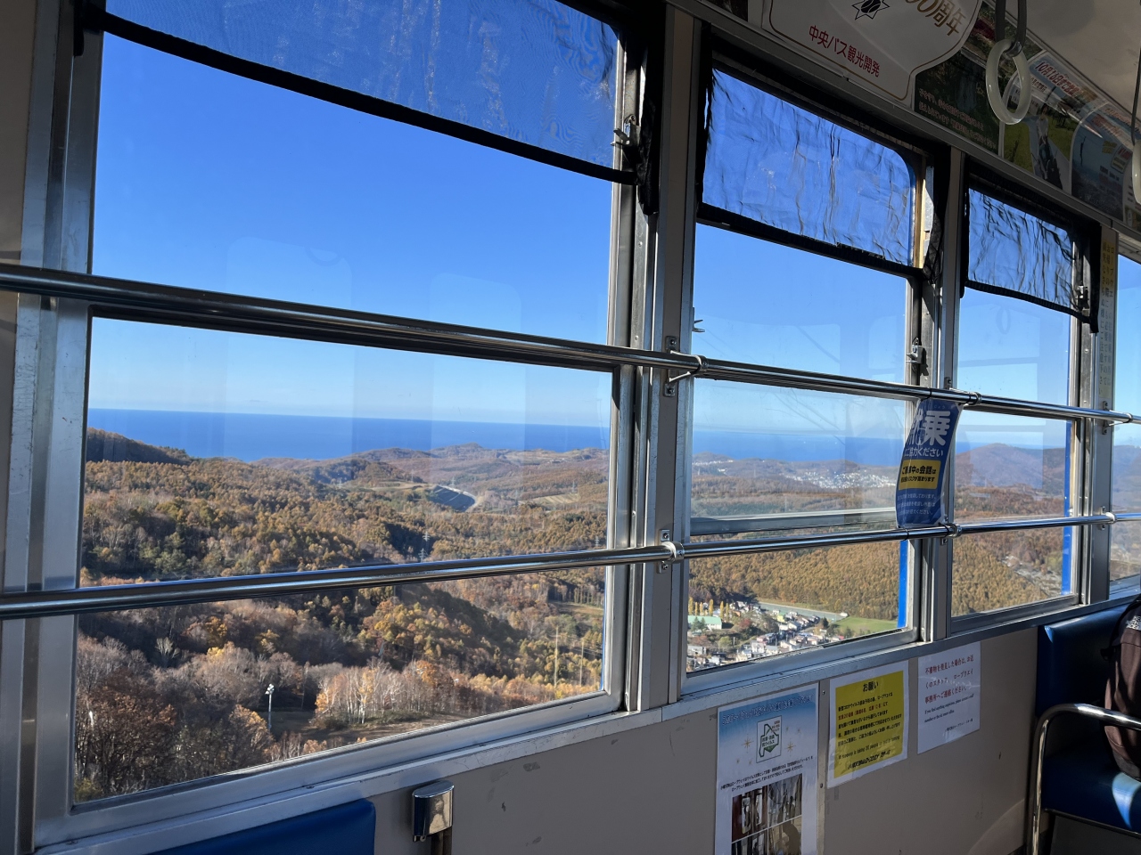 チケットは片道と往復があり、往復分購入すると少し割引になります。本来の定員は30名ですが、感染対策のため20名に減らして運行しているとのことでした。ただ実際には、20名も乗ることなく、もっと少人数の乗車人員でした。ゴンドラ内はゆとりがあって、ゆっくりと景色を楽しめて良かったです。ゴンドラは、赤と青の2種類で、それぞれ「OTARU」、「TENGU」と名前が付いていました。山麓から山頂までの所要時間は約4分です。