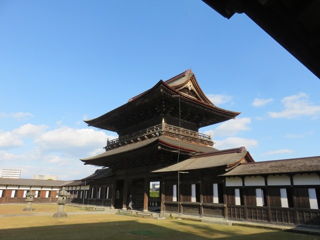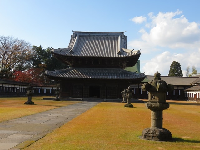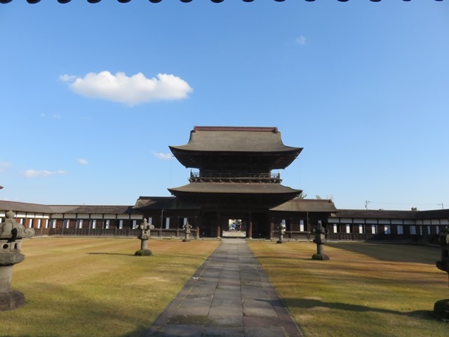 左右対称の伽藍配置、赤と青の戸室石を市松に配した参道、樹齢600年もの欅の木目を雲海に見立てた仏殿