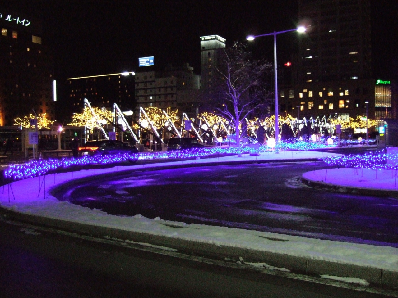 函館駅を出るとすぐの駅前広場にもイルミネーションがあり、函館山と漁火と海をイメージした美しくてきらびやかな光の海になっていました。