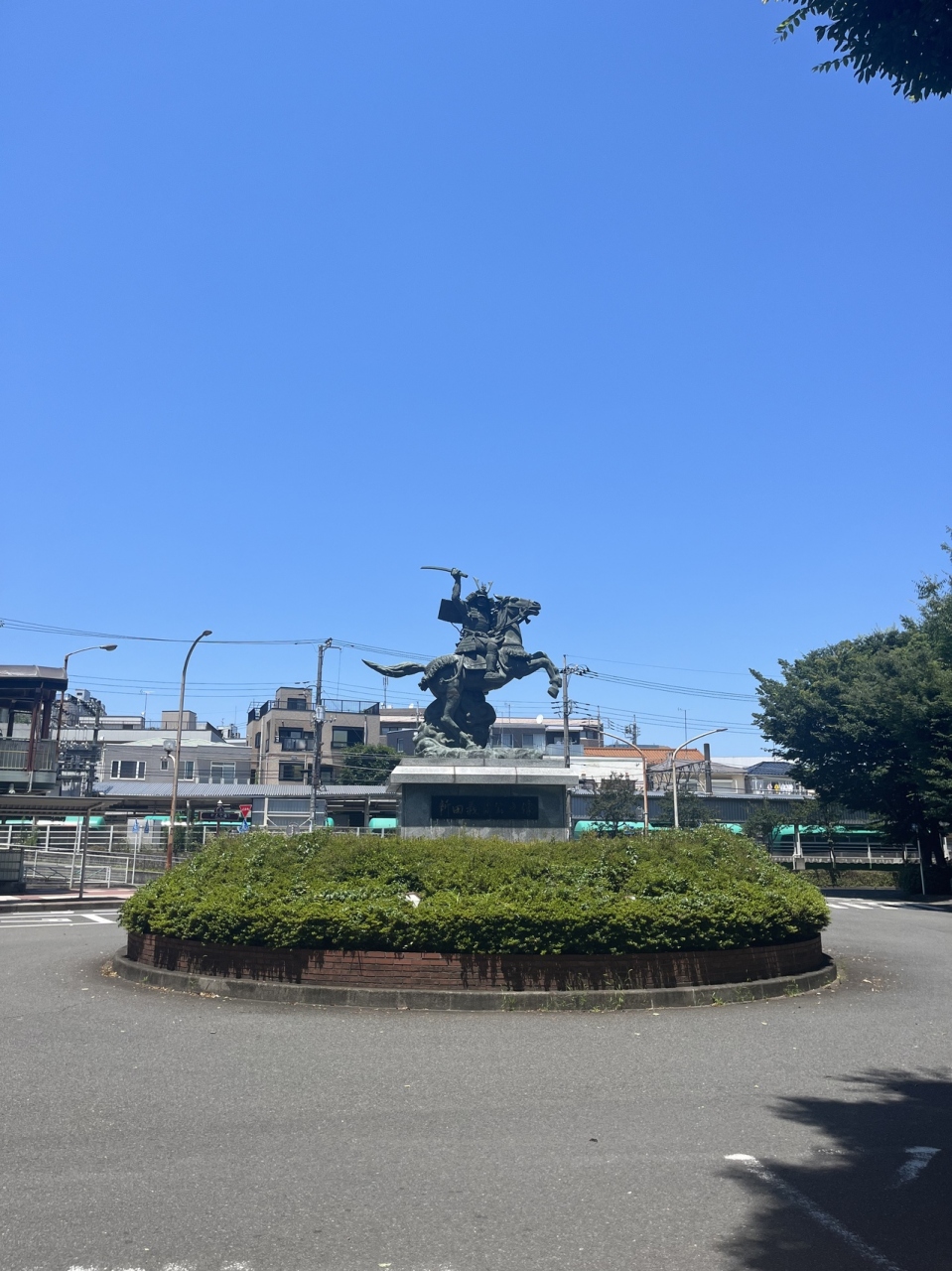 分倍河原はJR南武線と京王線の乗り換え駅となっているので、比較的乗降客の多い駅ですが、東京都は思えないほど、のんびりとした時間が流れています。駅前のロータリーには、なかなかタクシーが来ず、ずっとタクシー待ちをしておりましたが、ロータリーの中心に武将・新田義貞の騎馬像が建てられていました。分倍河原は古戦場の跡地としても知られ、その時に活躍した人物だそうです。