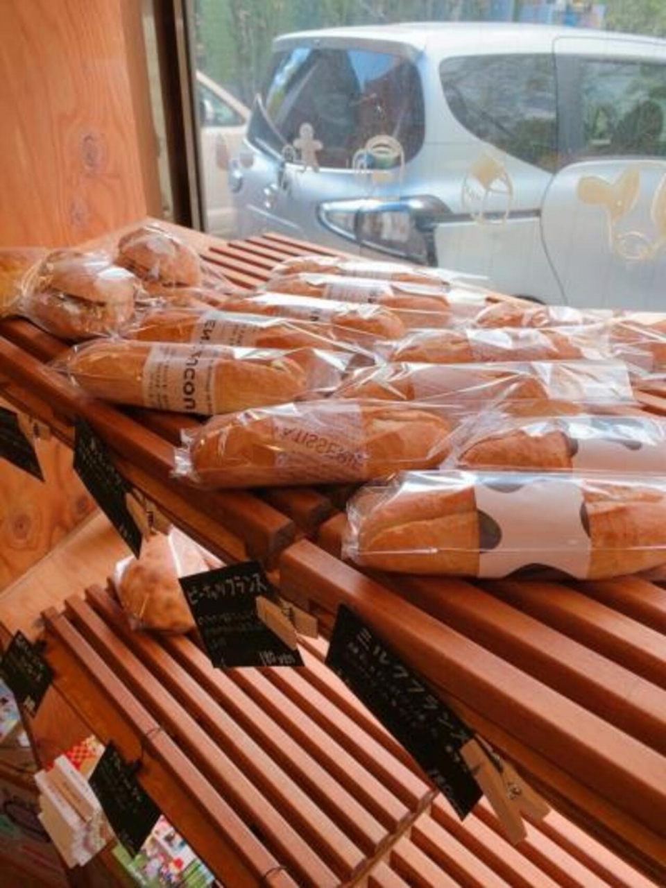 旅行先でも美味しそうなパン屋さんを見つけると立ち寄りたくなるので今回も勿論行きました。 お店の外には、大きな牛乳パックのモニュメント?みたいなのが建ってて、中には小さなテーブルと椅子が置かれているので、写真スポットなのかもしれません。 それが良い目印にもなっていると思います。