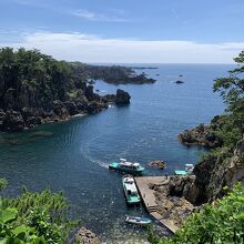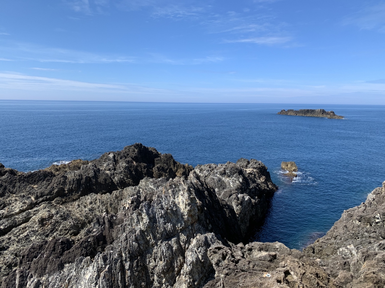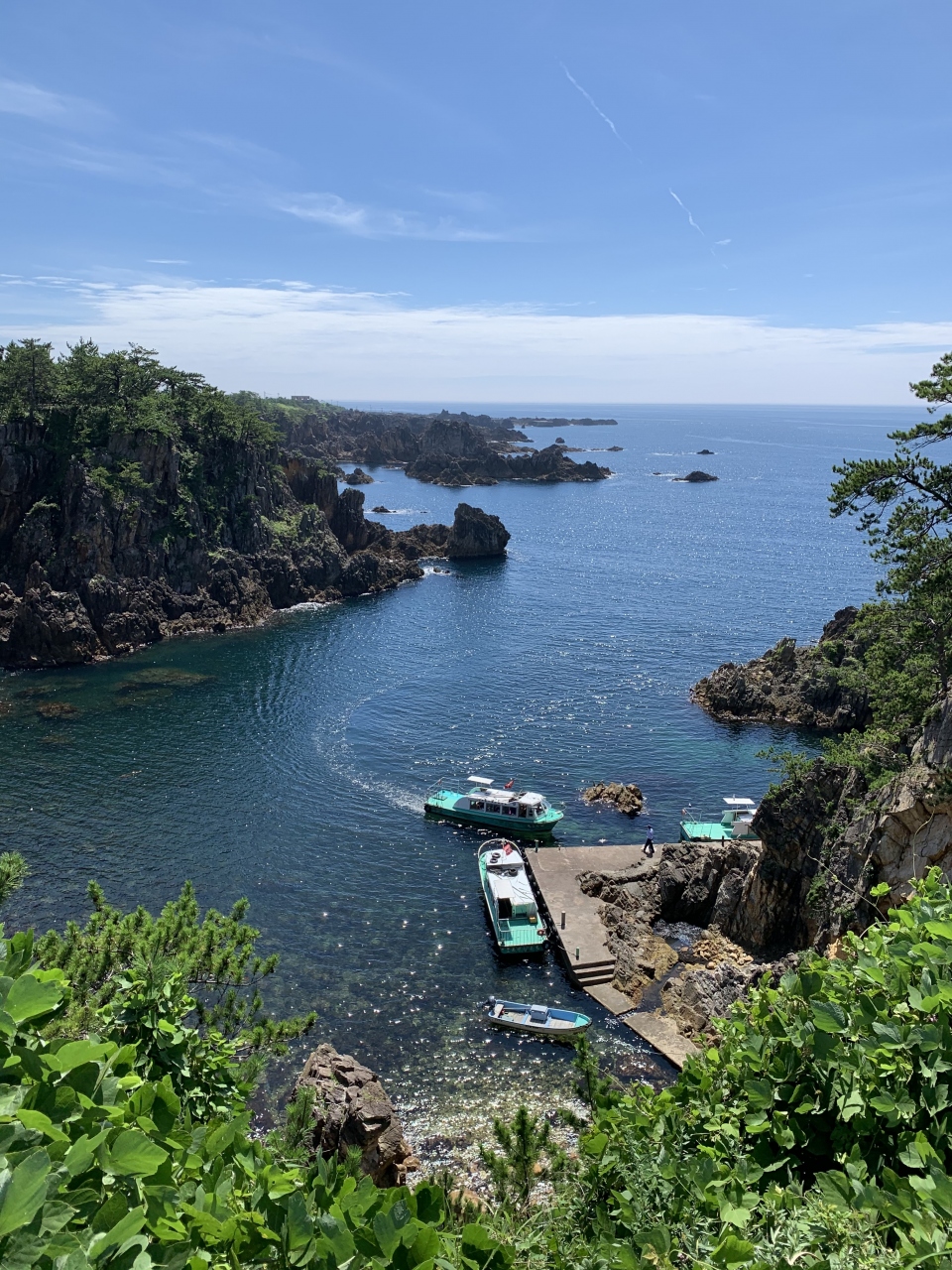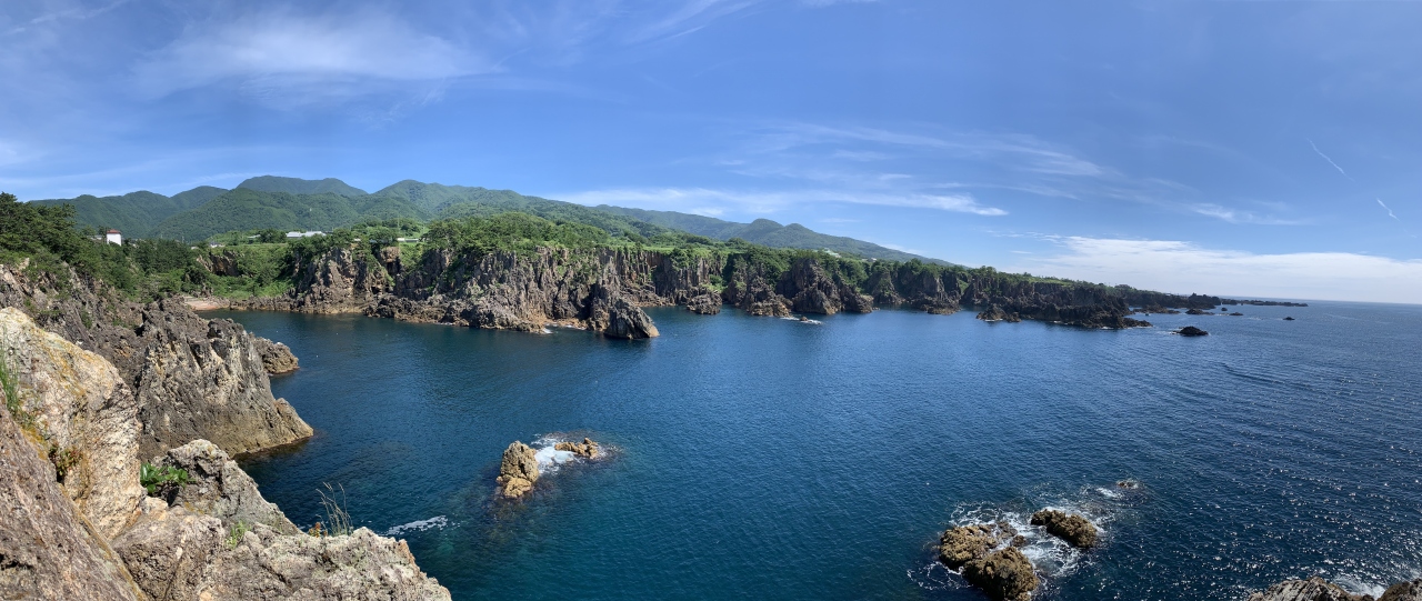 外海府海岸でもっとも有名な景勝地が尖閣湾です。尖閣湾は北狄から姫津にかけての約3kmにある5つの小湾の総称だそうです。外海府海岸の中でも特に有名で、ノルウェーのハルダンゲル・フィヨルドの尖った渓谷の美しさと対比してその名が付けられたらしい。断崖絶壁の岩礁は珊瑚礁の名残で、海の青、岩の灰茶、山の緑のコントラストがスゴイ美しいです。