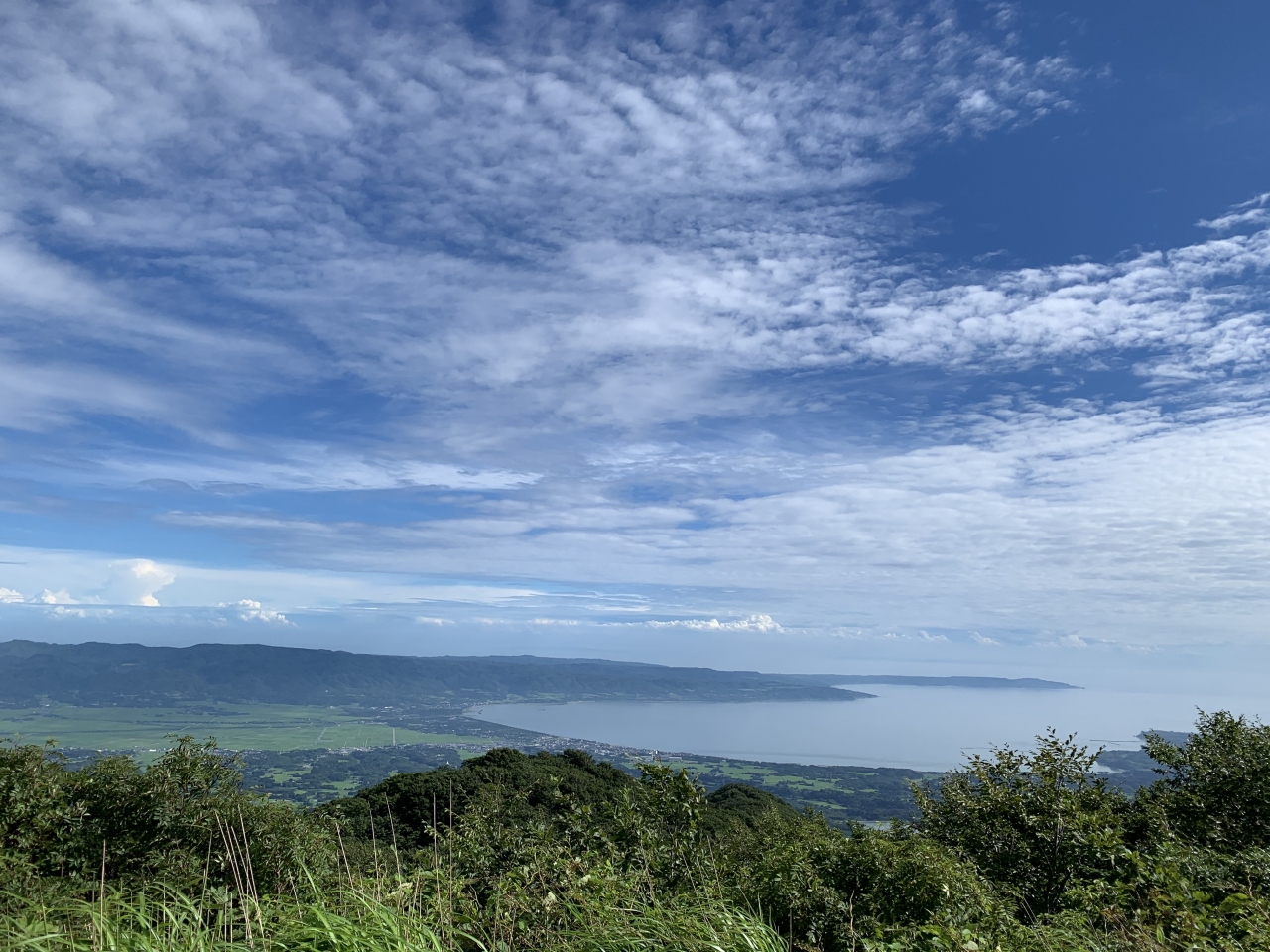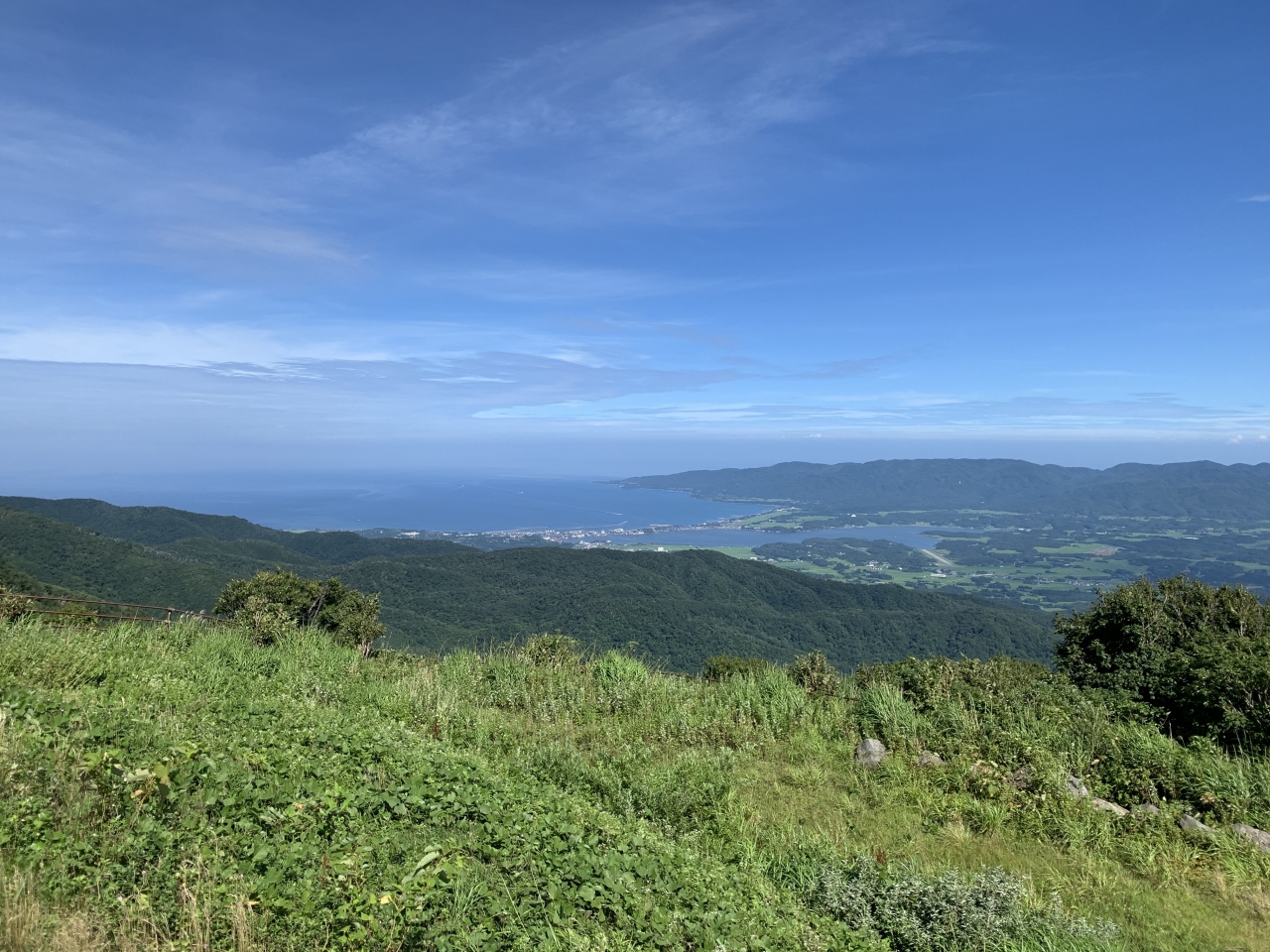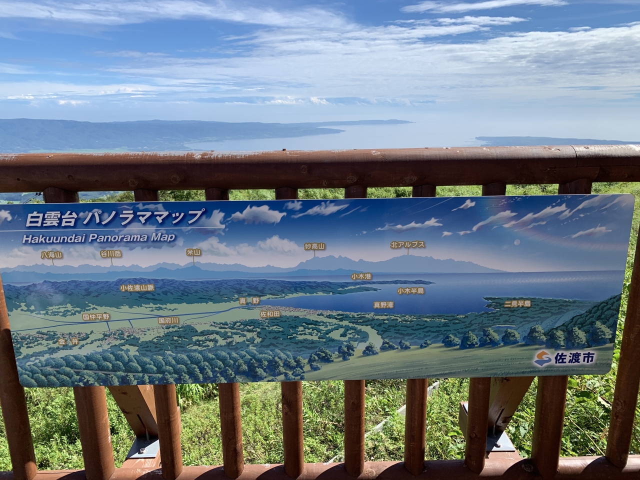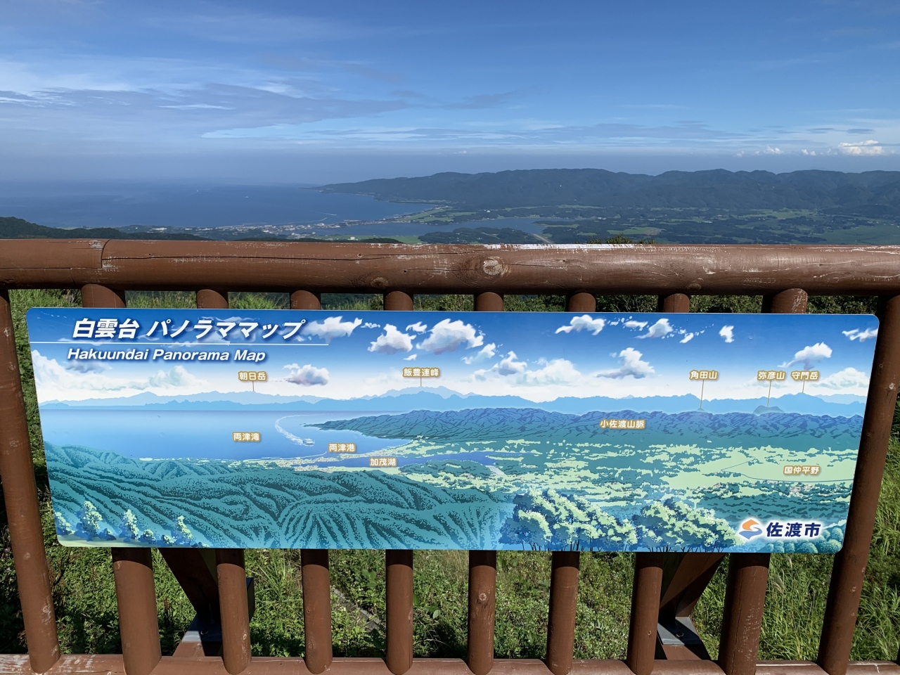 相川の街から「大佐渡スカイライン」の約15kmの山ツーリングを経て「交流センター 白雲台(はくうんだい)」へ到着。標高約850mに建つ山小屋風の建物です。展望デッキからは、両津湾の大パノラマが広がっていました。ここまで登ってくると真夏でもさすがに風が涼しかったです。交流センターの店内には佐渡特産品が並んでました。とにかく景色が素晴らしいのでオススメです。
