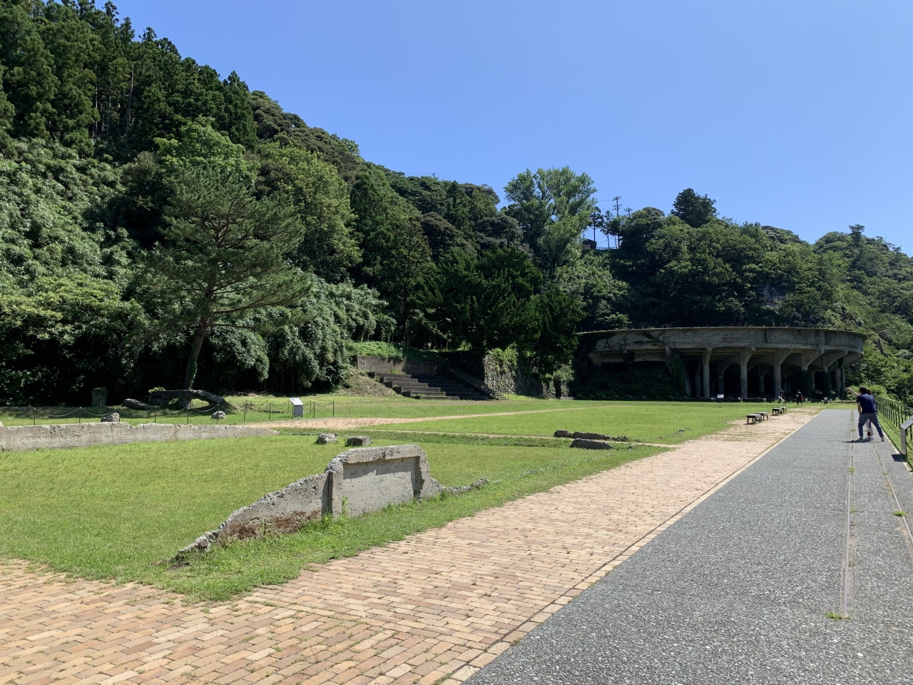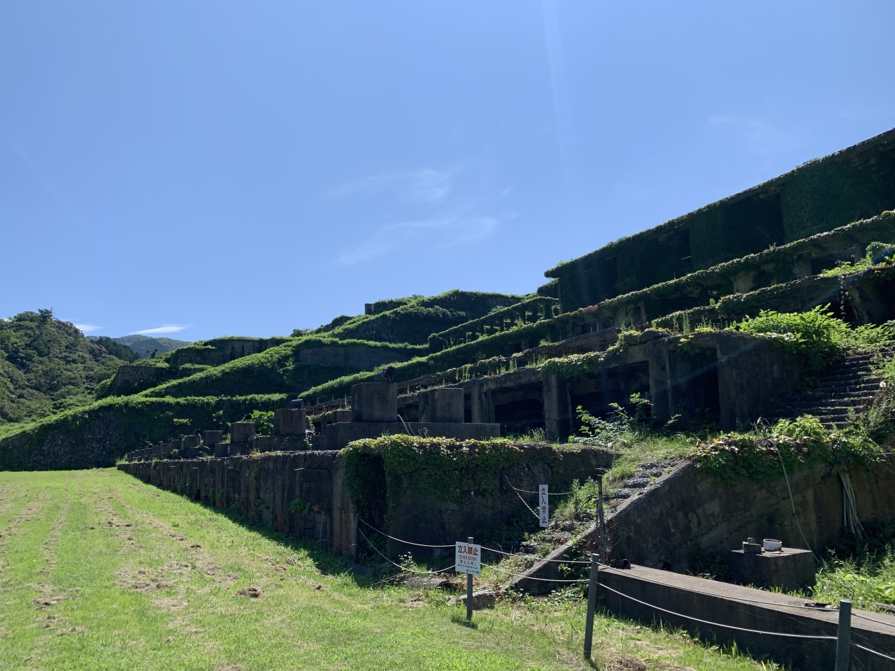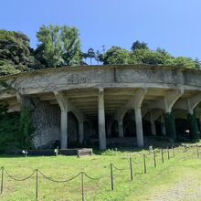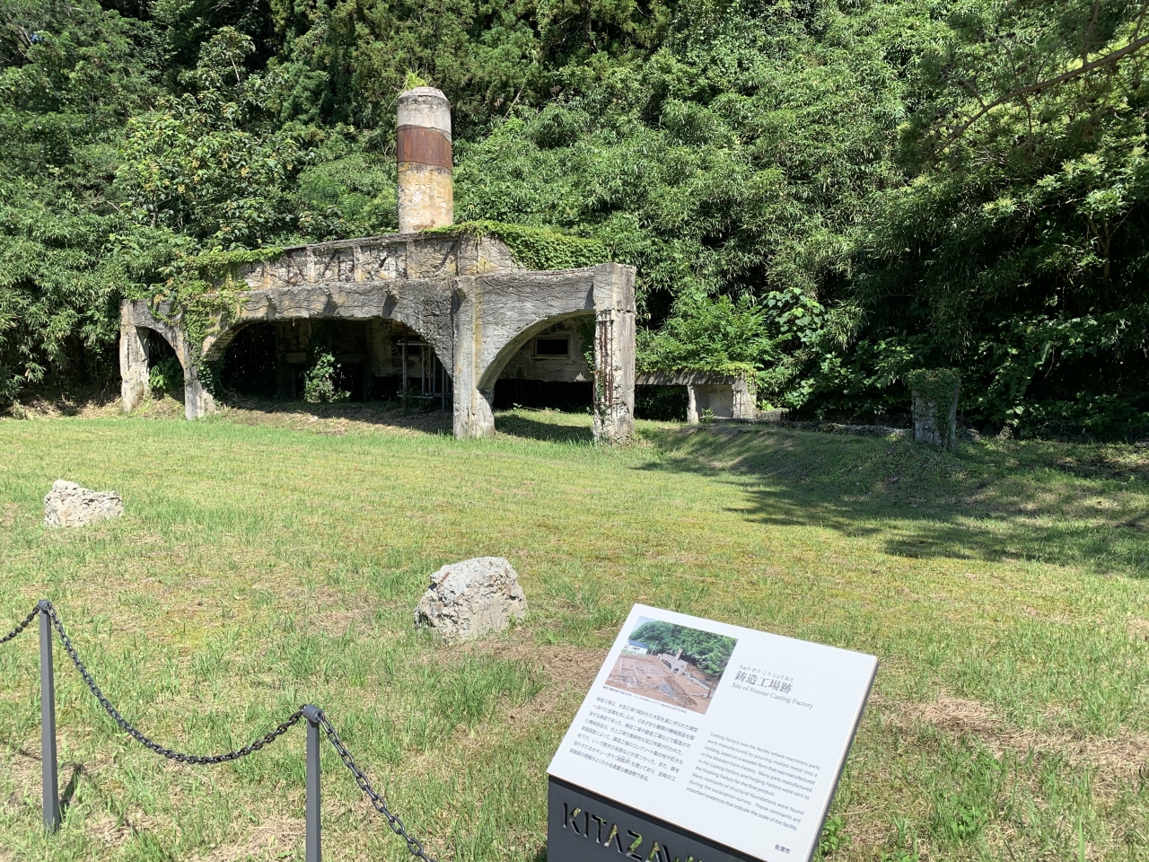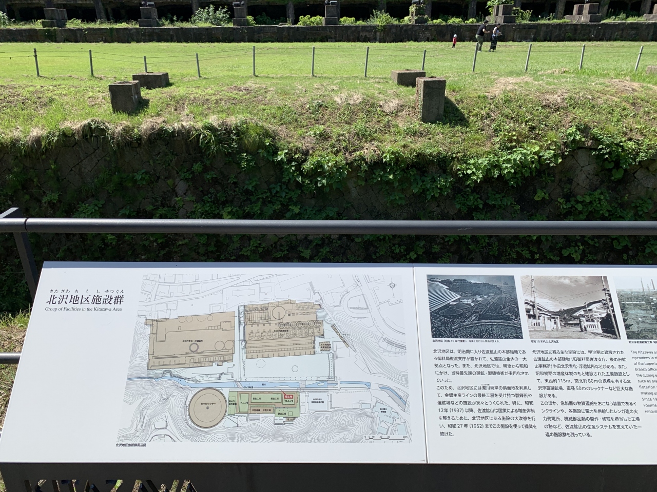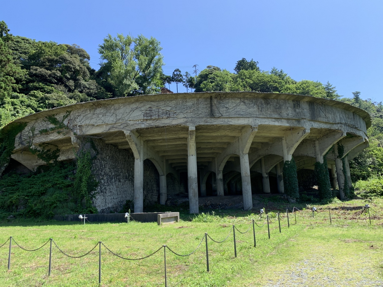 日中戦争後の昭和12~15年(1937~40年)にかけて整備された選鉱施設です。レンガ造りの三角屋根の建物は明治期の火力発電所。”浮遊選鉱”とは、砕いた鉱石を水槽に入れ、溶液を加えて鉱物だけを浮かせる分離設備です。工場の跡地の奥にあるのが沈降分離装置「シックナー」。昭和15年(1940年)に完成した比重差で分離する装置で、ここで泥鉱から水分を分離して向かいの北沢浮遊選鉱場へ送っていたそうです。国力を高めようとしていた昭和初期、資源が出るとなると離島だろうとどこにでも活用インフラを整備した当時の日本の活力を感じます。なお、北沢浮遊選鉱場の古い写真は、近くの相川郷土博物館で見ることができます。