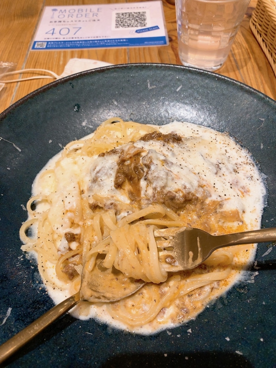 前回はカルボナーラを注文したので、今回は別のパスタを食べてみたい!と思い、チーズソースのかかったボロネーゼを注文。 生パスタは他のパスタ屋さんでも良くお目にかかる、淡路麺業の麺で、美味しい事が既に分かってます!