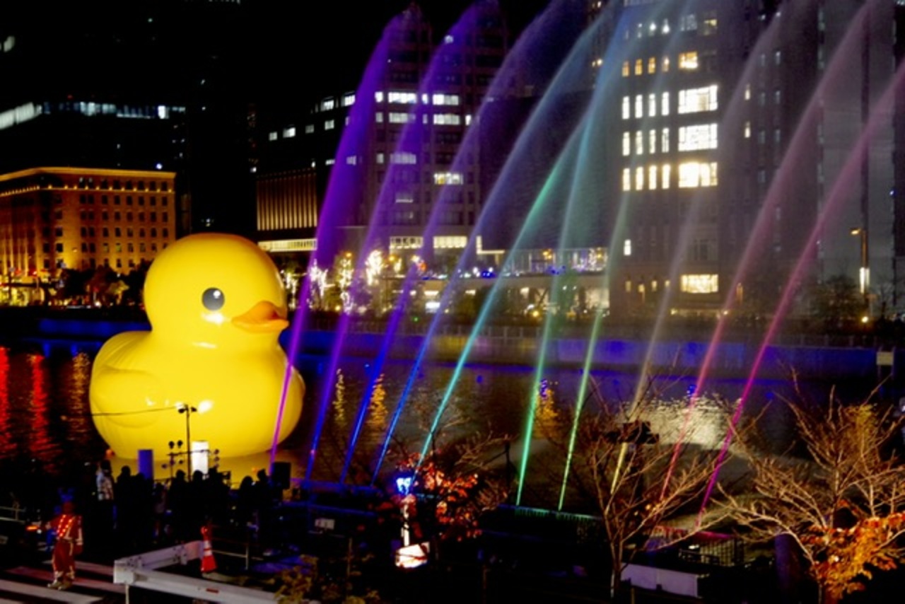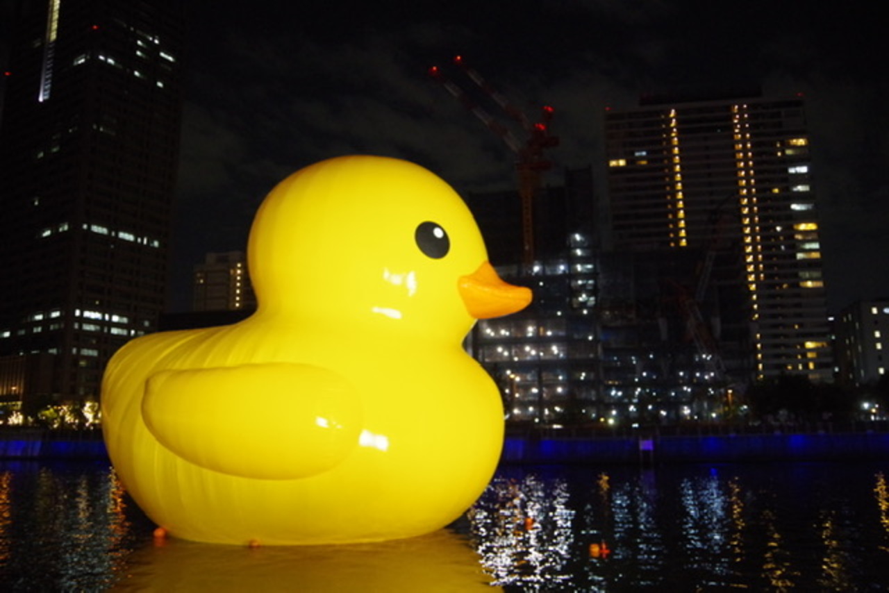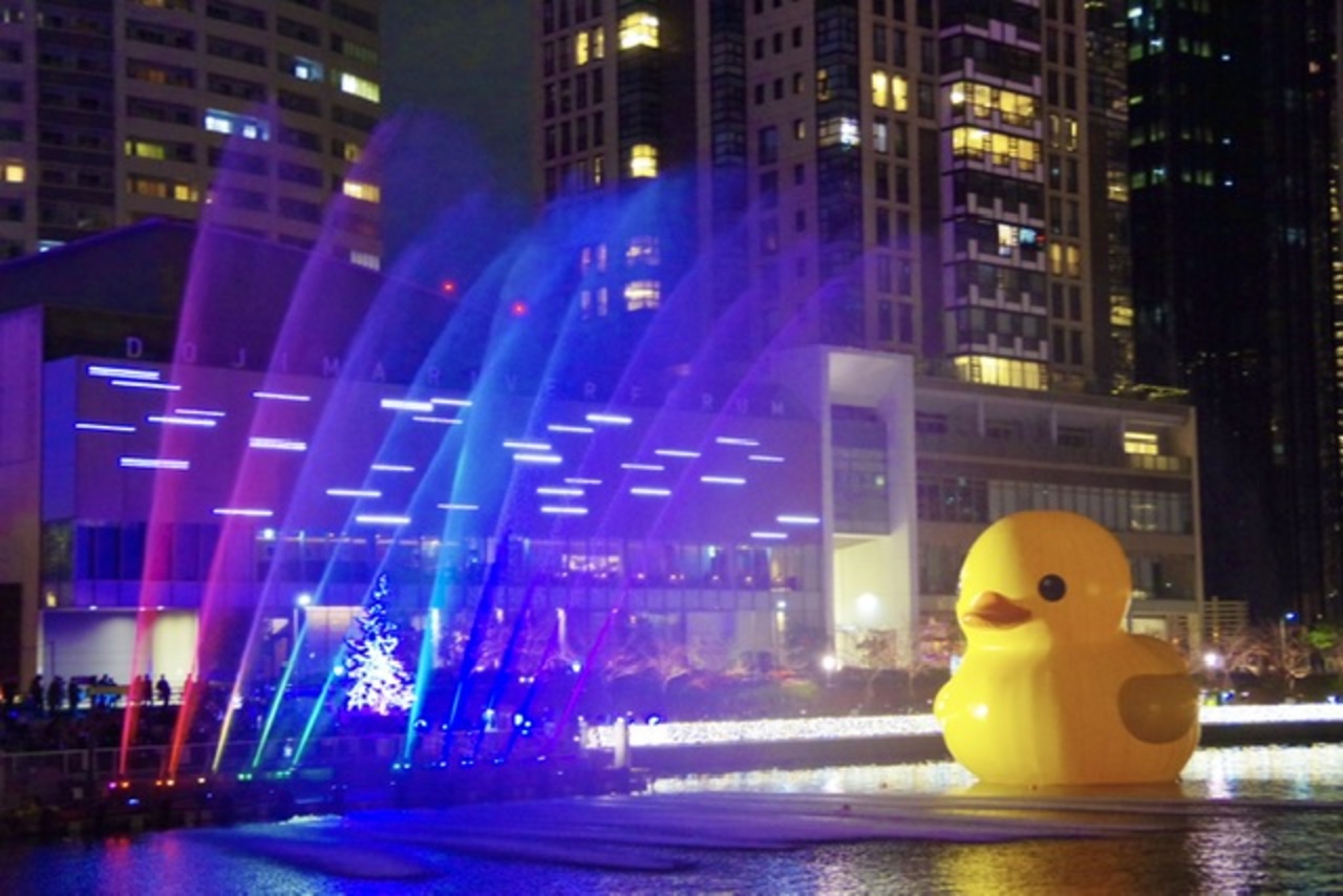写真撮影すると、バックのビル群とのコントラストが面白すぎます! 夜になると、15分に1回の噴水ショーも行われるので、ライトアップされた噴水とラバーダックの共演もなかなか楽しいです。