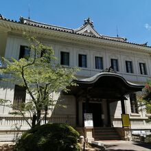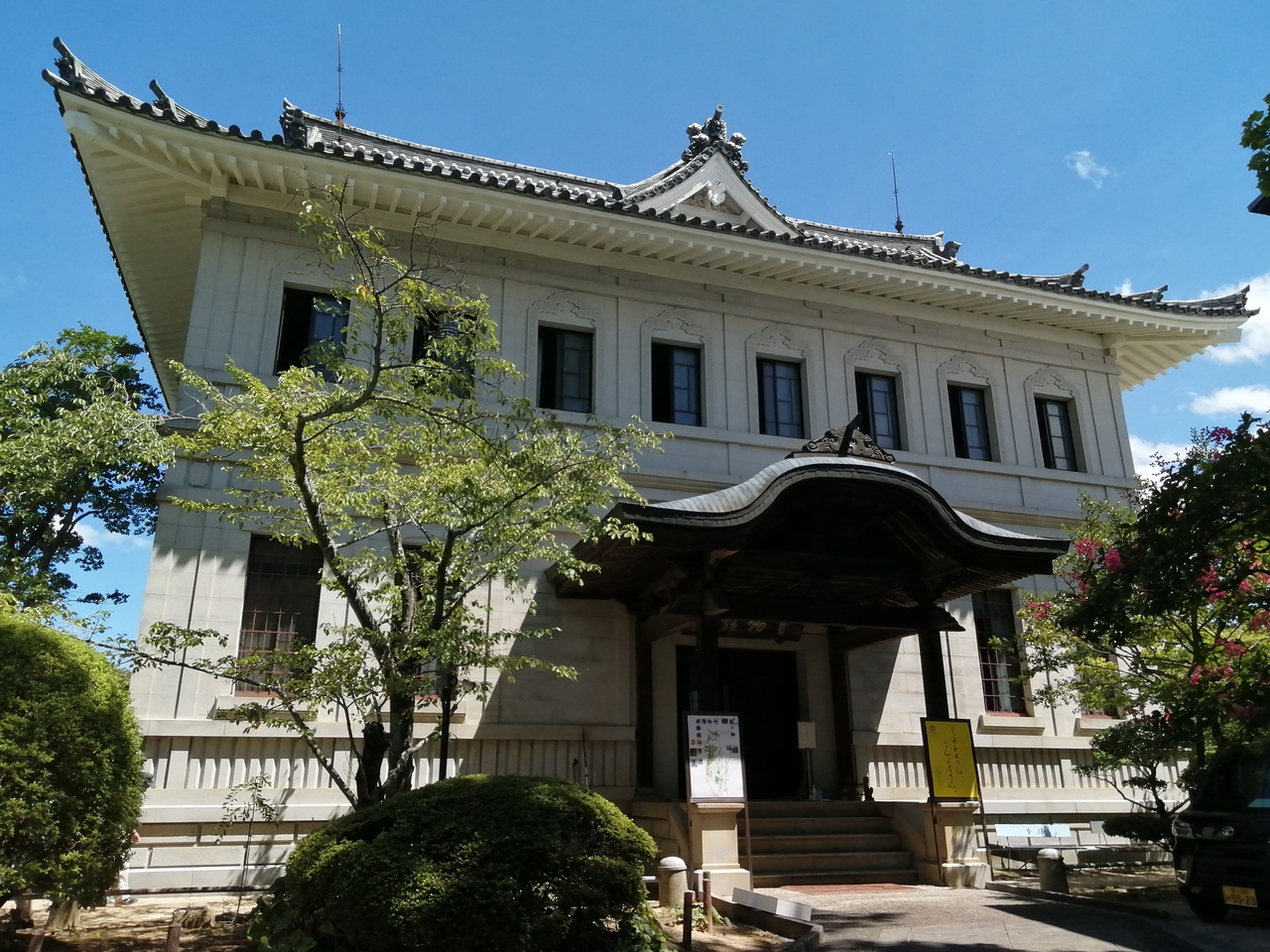 表参道の大門をくぐり、その先右手に入口があります。しかーし無情にも臨時休館中の立て看板が…。試しに進んでみました。どうも改装工事中のようです。もちろん館内には入れませんでしたが、外観を鑑賞。花崗岩造りの2階建て、屋根は瓦葺、玄関は唐破風造りの和洋折衷の重厚な建物。明治38年(1905年)に建てられたもののようです。なかなか見応えがあります。建物だけでも見られてよかったです。