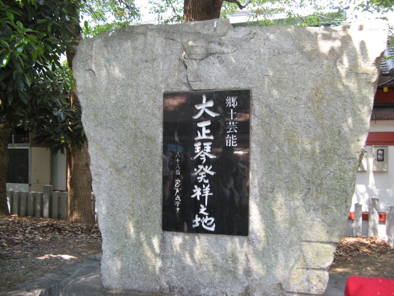 地下鉄の大須観音駅から歩いて直ぐ、大須観音の境内にあります。駒札によると明治四十五年大須生まれの森田五郎と言う方が大正琴の原型を考案したそうで、その功績を顕彰するために建てられたものです。立派な石碑でなので大正琴の愛好者の方は大須観音をお参りされたついでにでも是非。
