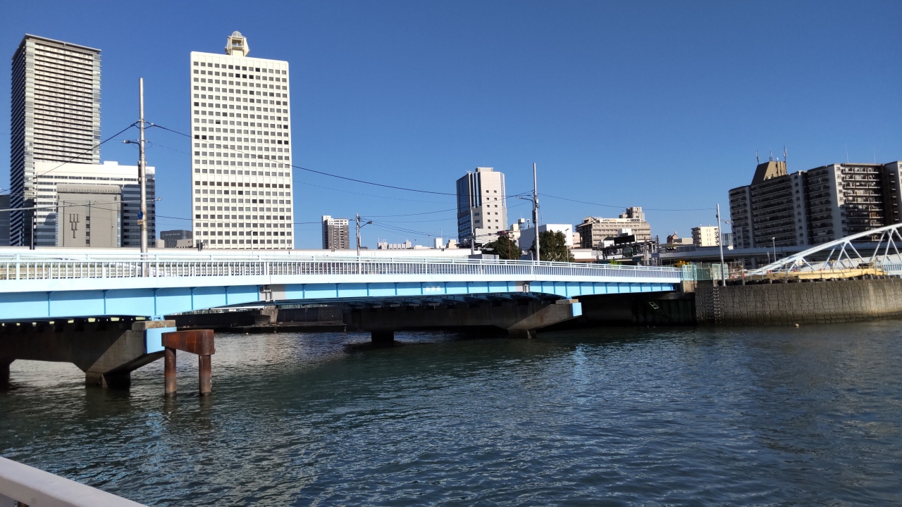 船津橋は、水の都大阪の堂島川に架かる橋の1つです。大阪市福島区玉川1丁目・野田4丁目と北区中之島丁目を結んでいる橋です。土佐堀川に架かる端建蔵橋と南詰で接しています。最初の橋は、江戸時代(元禄中期)に堂島新地開発の一環として架けられたものです。現在の橋は、昭和38年(1963年)に架けられた橋長76.5m、幅員24.0mの三径間ゲルバー桁橋です。