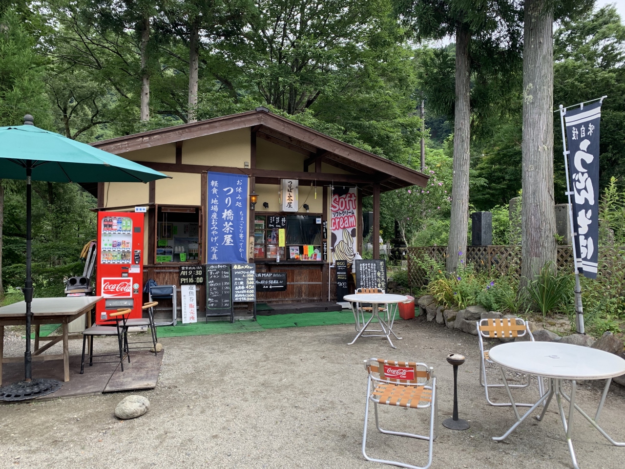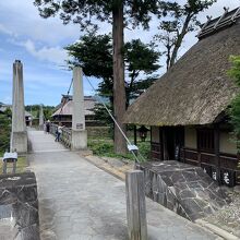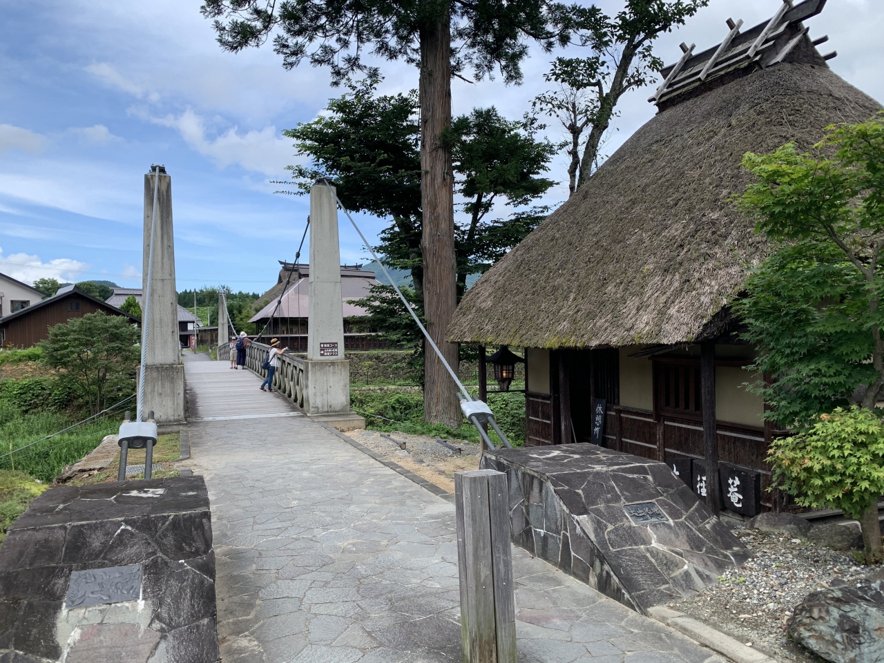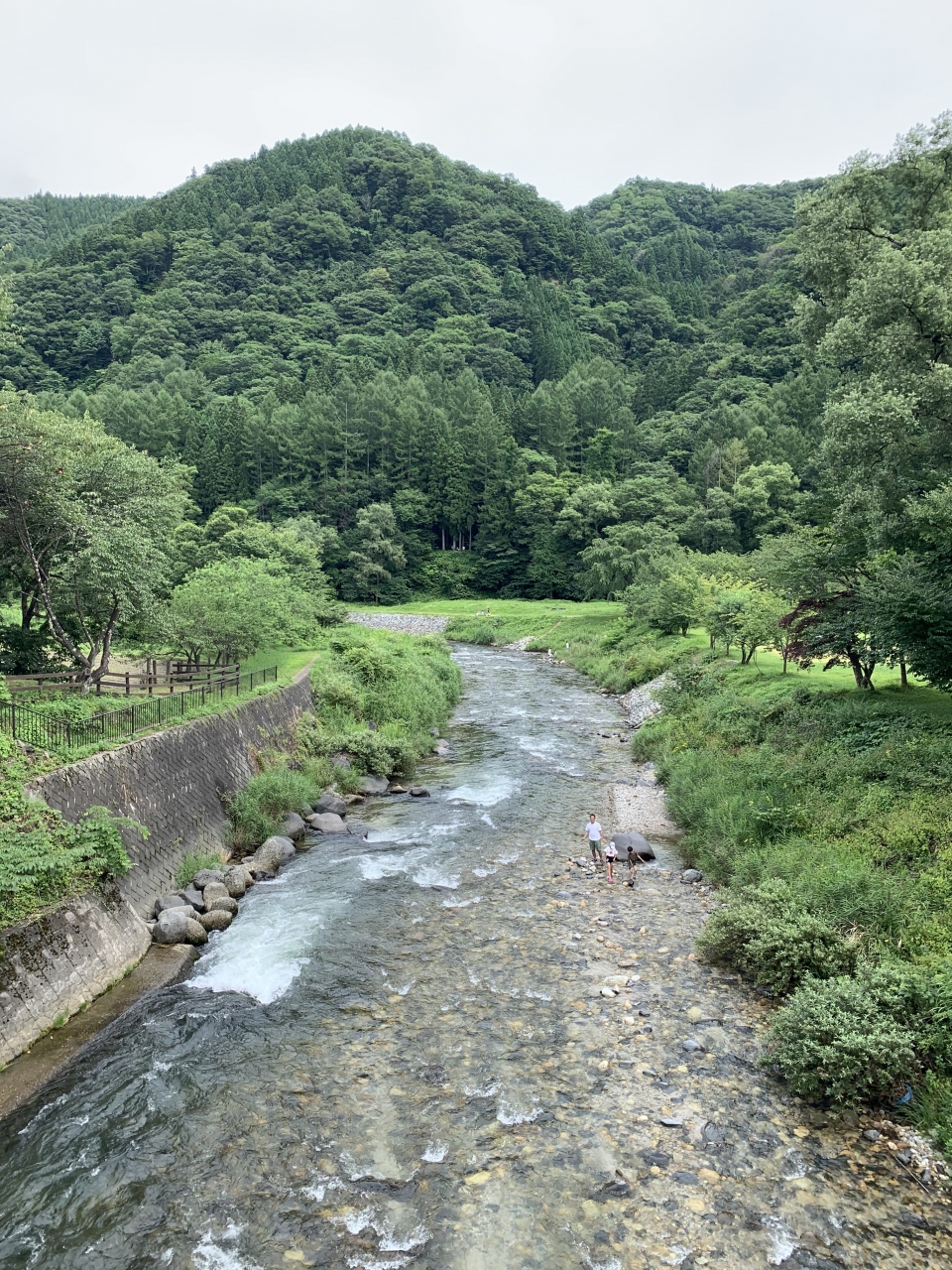 白馬駅から東へ1.5kmほど、姫川に架かる「大出の吊り橋」へ。吊り橋の手前には古民家風の休憩所があります。北アルプスを背景に吊り橋の写真を撮るのが定番の様ですが、この日は北アルプスの山々は雲に隠れて見えませんので橋から姫川の清流を撮りました。晴れてればきっと絶景です。