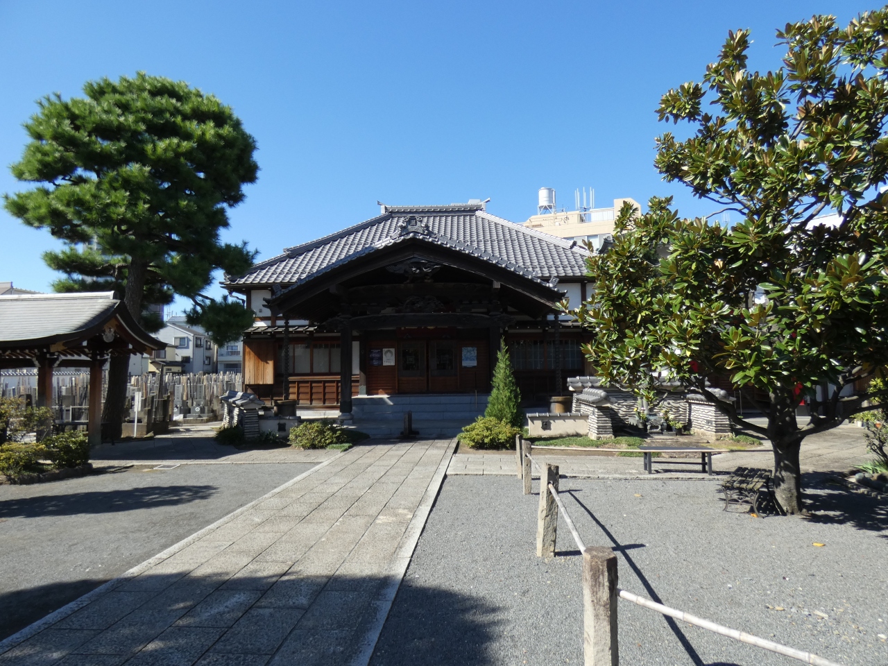 京急新馬場駅から東へ徒歩3分の目黒川の南側沿いに建つ日蓮宗寺院。大永2年(1522)自覚院岸日性が松陽院日増を開山として自邸に寺を改めた。現在の本堂は寛延4年(1751)再建で品川区内最古級の木造建築物だそうです。境内にはホームラン地蔵や軍艦千歳殉難者の碑が建っています。