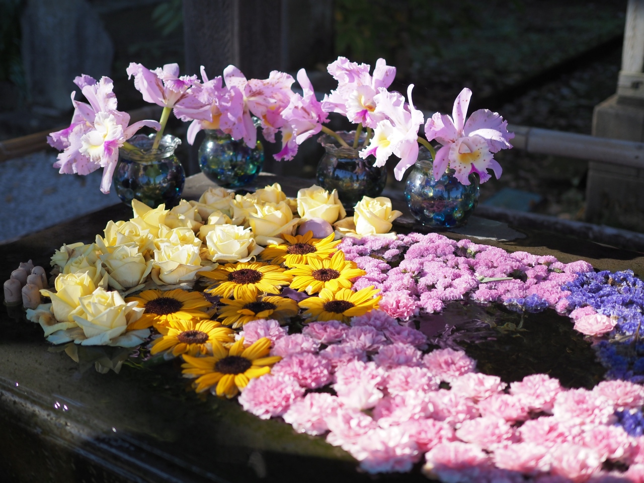 花手水を巡るツアーで立ち寄りました。社務所に人懐っこいネコちゃんが受付をしていました。この神社には4匹のネコがいるらしく、絵馬もネコの顔でした。行田は花手水で町おこしをやっていて神社にもカラフルな花アートがありました。