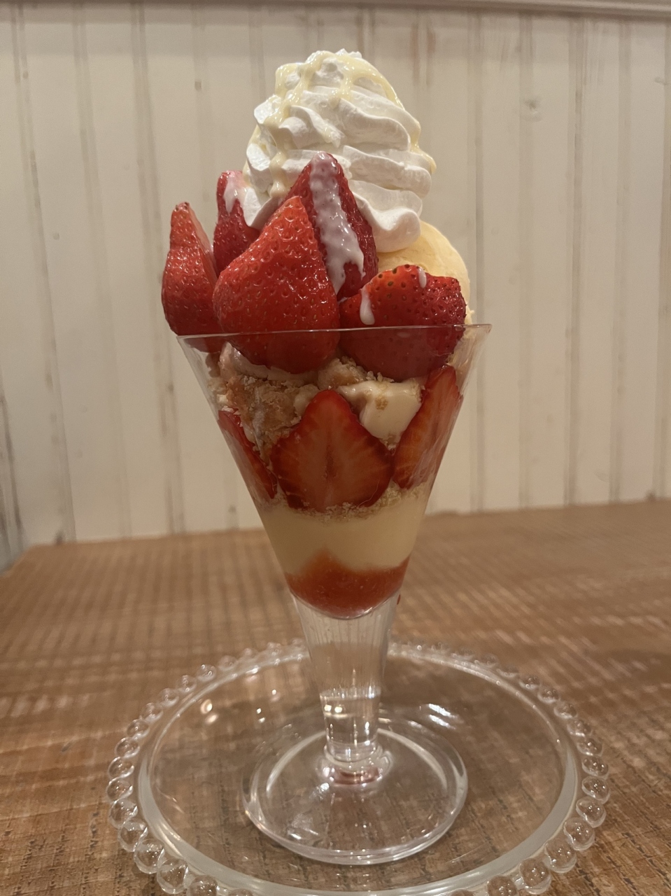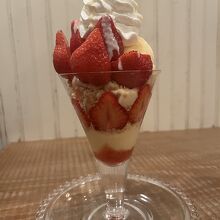 苺の季節ではなかったのですが、店頭にはあまおうや長崎県産ゆめのかなど、苺がずらりとディスプレイしてあり、メニューにもあまおう苺パフェがありました。夜遅くまでやっているので、締めパフェとして完食しました。