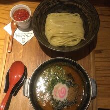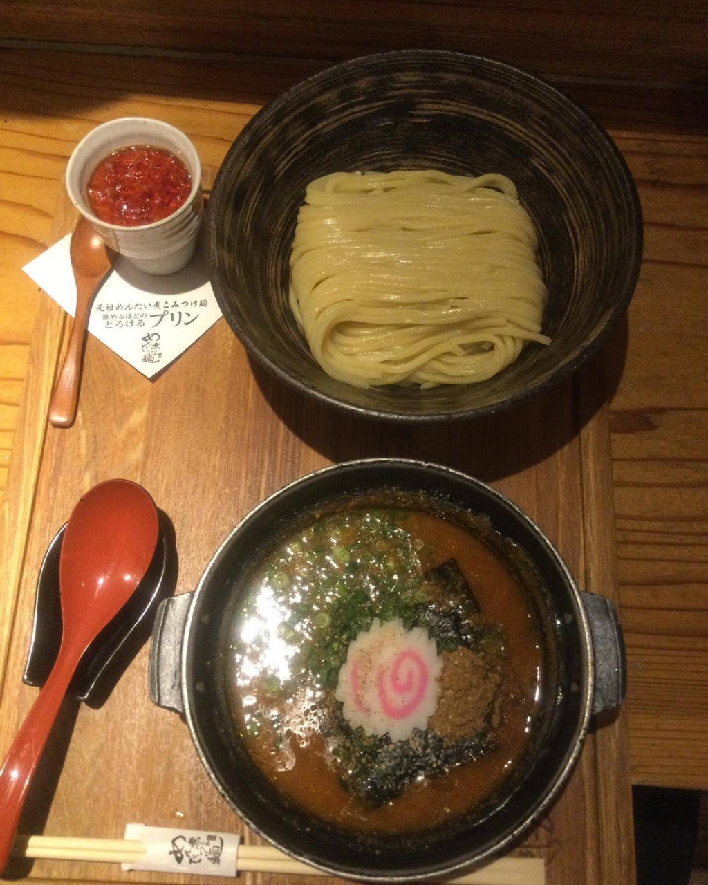 プリンとセットになった元祖めんたい煮こみつけ麺をいただく。