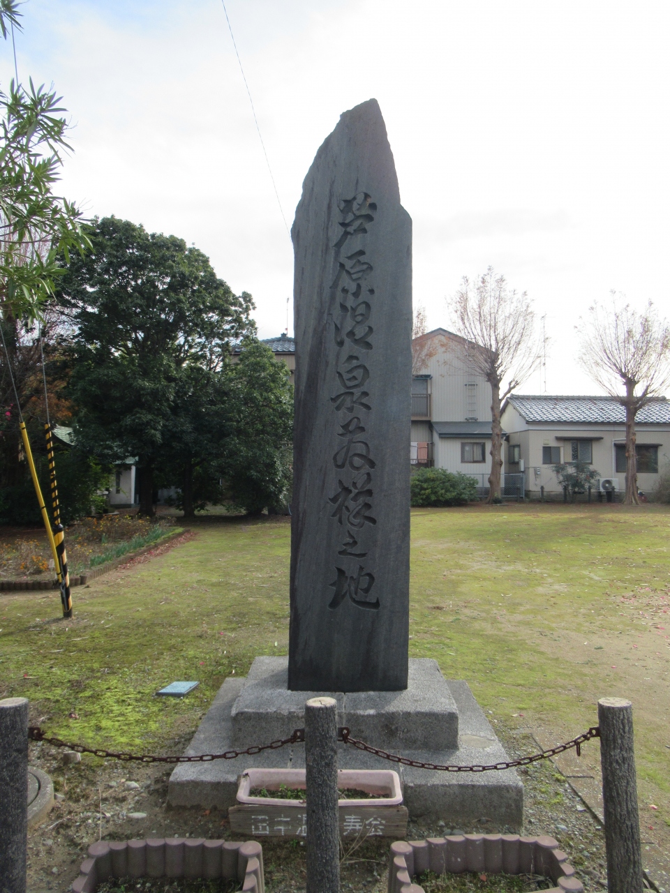 えちぜん鉄道・あわら湯のまち駅から8分ほど、ホテル・まつや千千に向かう途中の、ホテル近くの踏切を渡り右手に少し行った空き地のような公園に碑と説明板が建っています。それによると、水不足が起こり近くの農家に大恐慌をもたらした明治16年に、灌漑用の井戸を掘った際、塩分が含まれた湯気の立つ水が湧き出たそうです。十楽温泉として評判になったものの枯れてしまったそうですが、隣接するエリアから温泉が湧き出て温泉街が形成されていったとのことです。その記念として建てられた碑が建つ公園です。