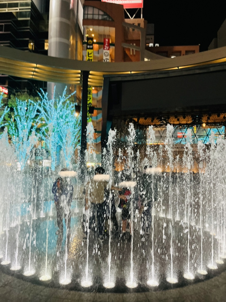 高く噴き出した 噴水の中 に取り残されて 出られない子どもたち と ブルーのイルミネーション