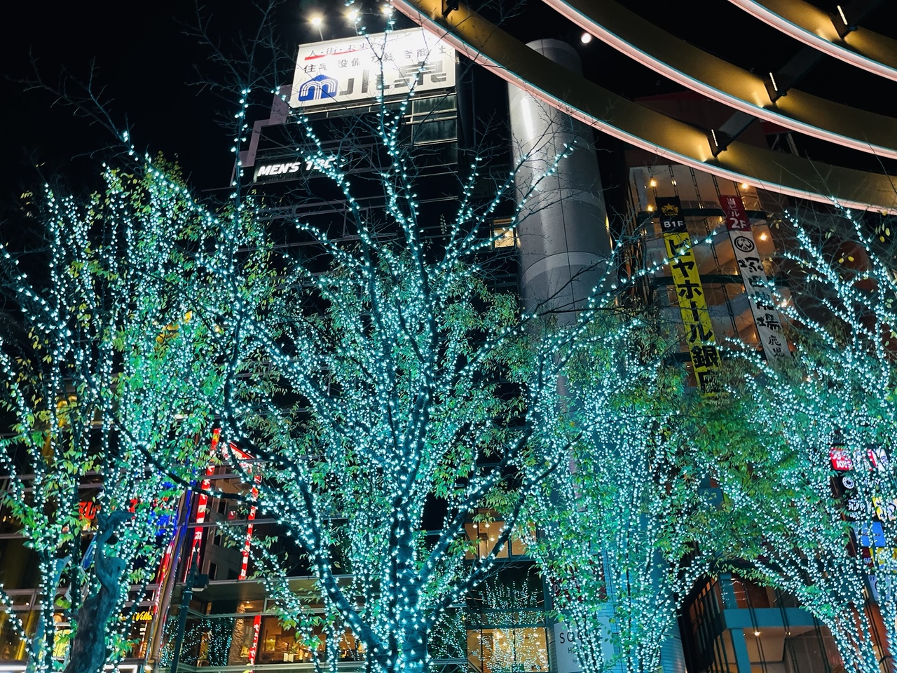 今回 公園の樹木を彩る アクアブルーのイルミネーションが とてもキレイでした◎